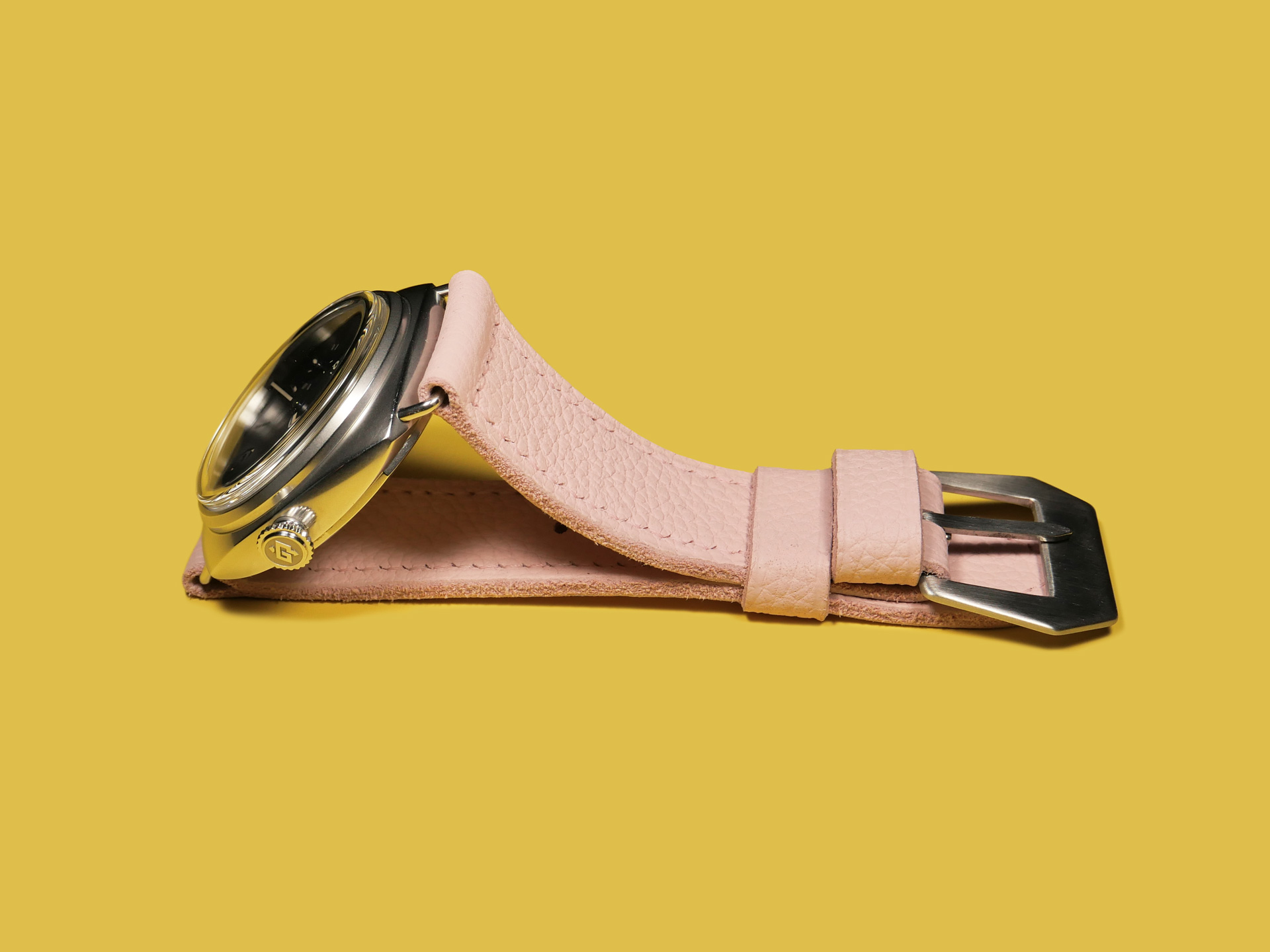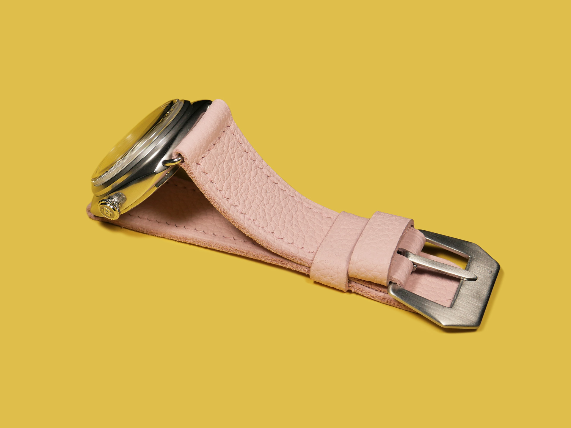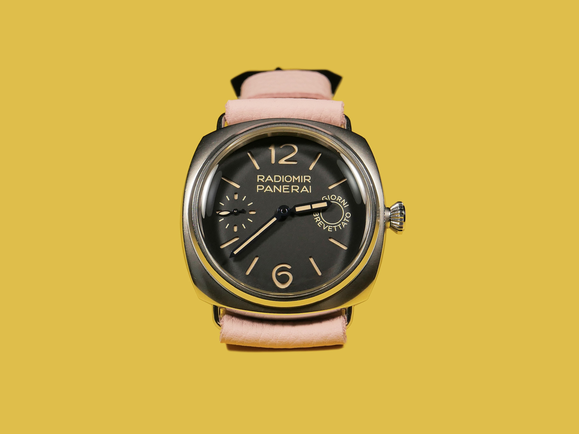 I designed this strap with one floating keeper and one fixed. The edges of this strap feature a soft crease. Though designed for a vintage style pin buckle (as pictured), you may select from a variety of different buckles from the drop down menu. As with all of my straps, nearly any aspect can be customized for you. Pictured above, you may see this pink Radiomir strap on the Panerai Radiomir 8 Days PAM00992. *For reference, the strap in the photos measures 125-80.