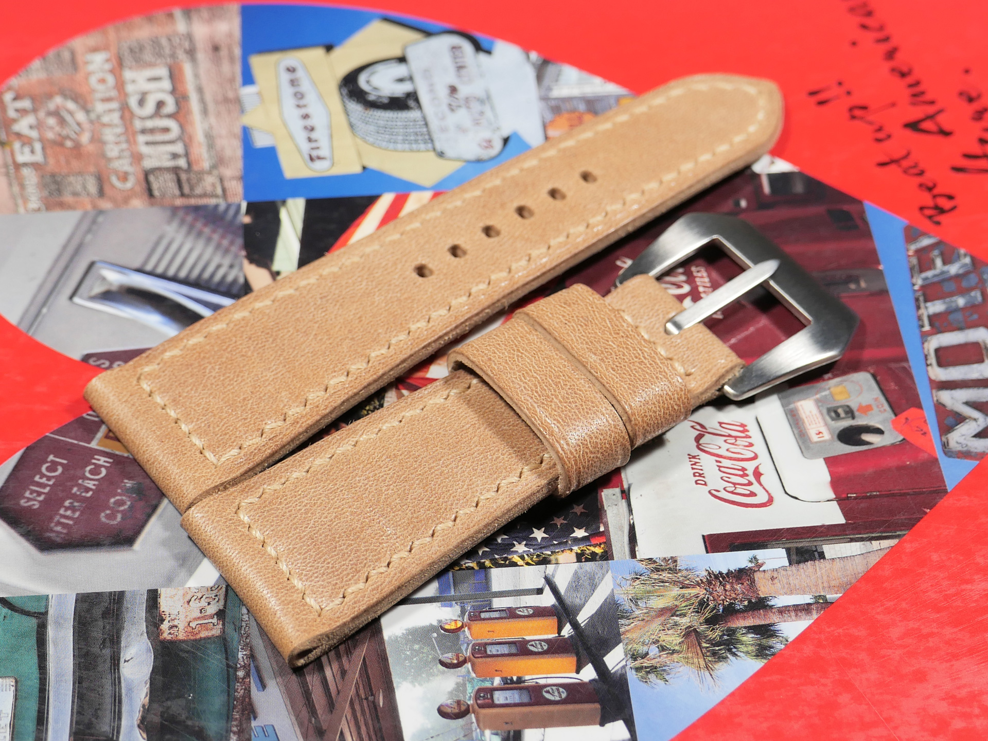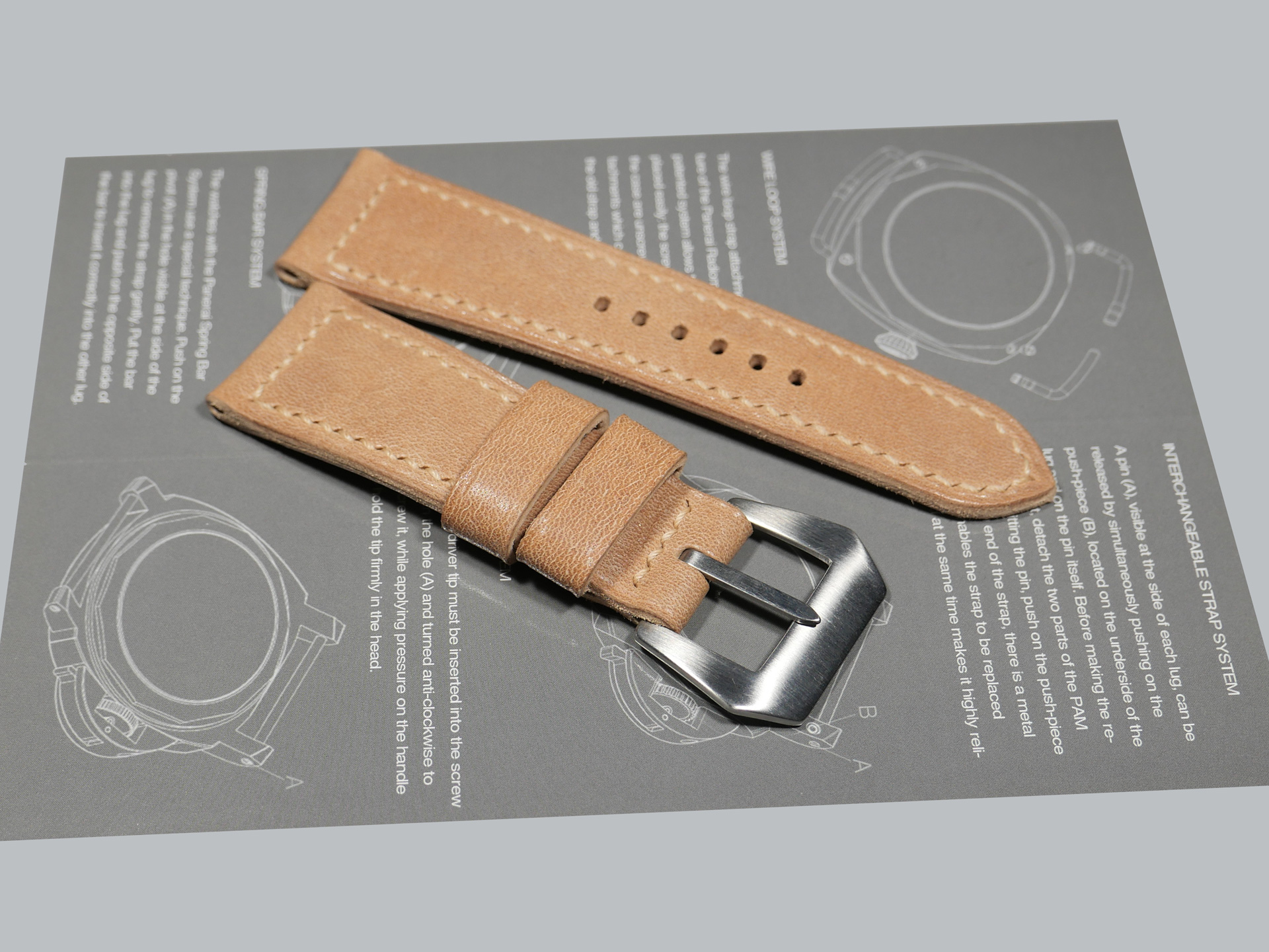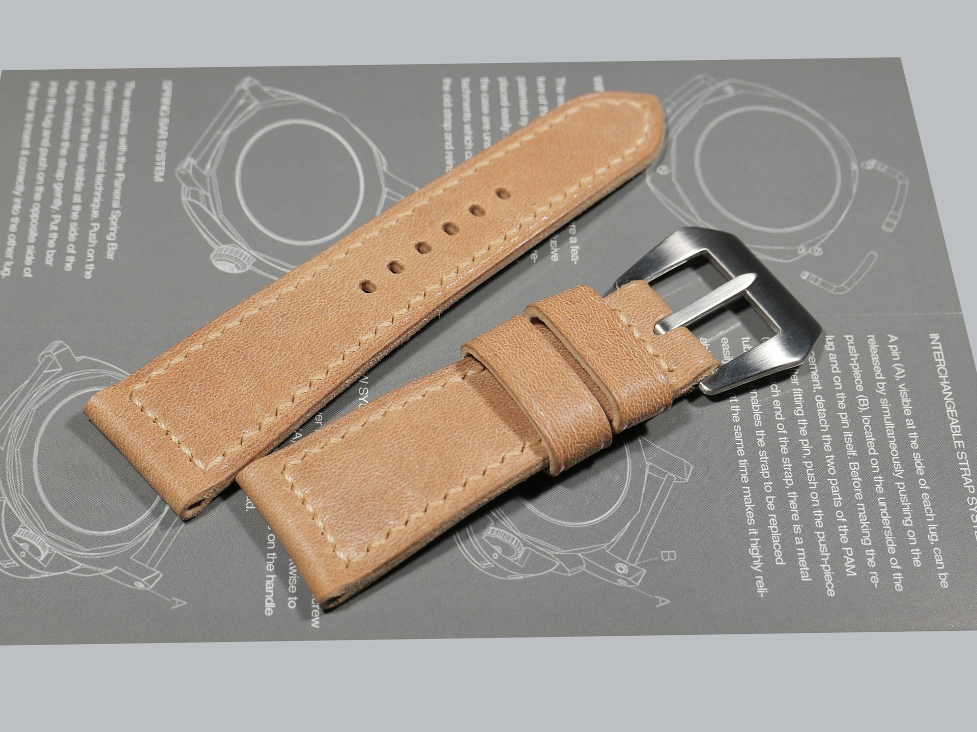 About the Leather: *Limited to 5 pieces due to scarce leather. I assembled this beige Panerai Radiomir strap 100% by hand and hand stitched it, as with all of my straps. I selected for this project a premium chrome tanned leather with a medium light beige tone. This light tan Radiomir strap is of a soft rigidity and features gently creased edges. Additionally, the strap implements two keepers; one floating and one fixed. I selected a light beige thread for the stitching.