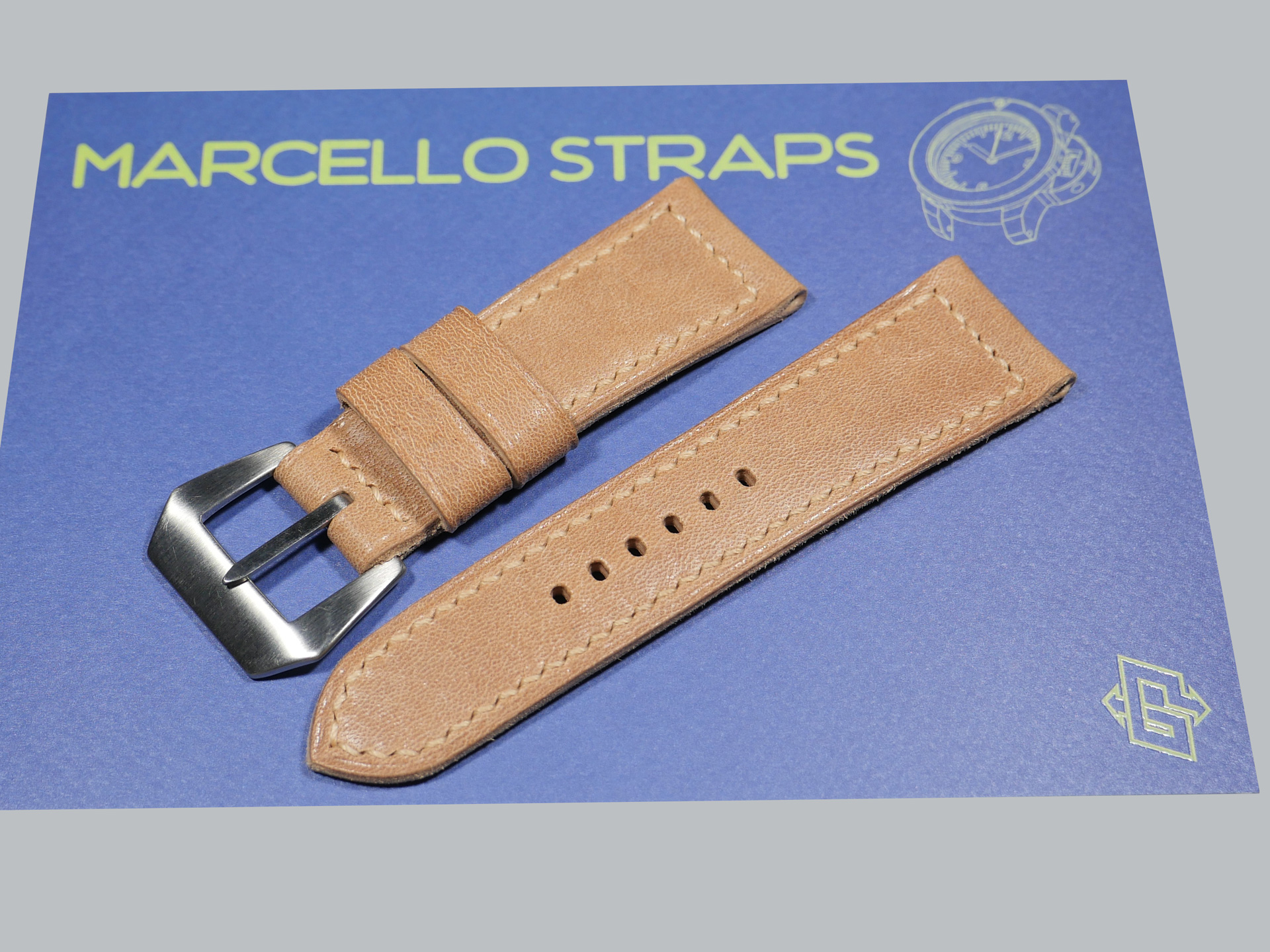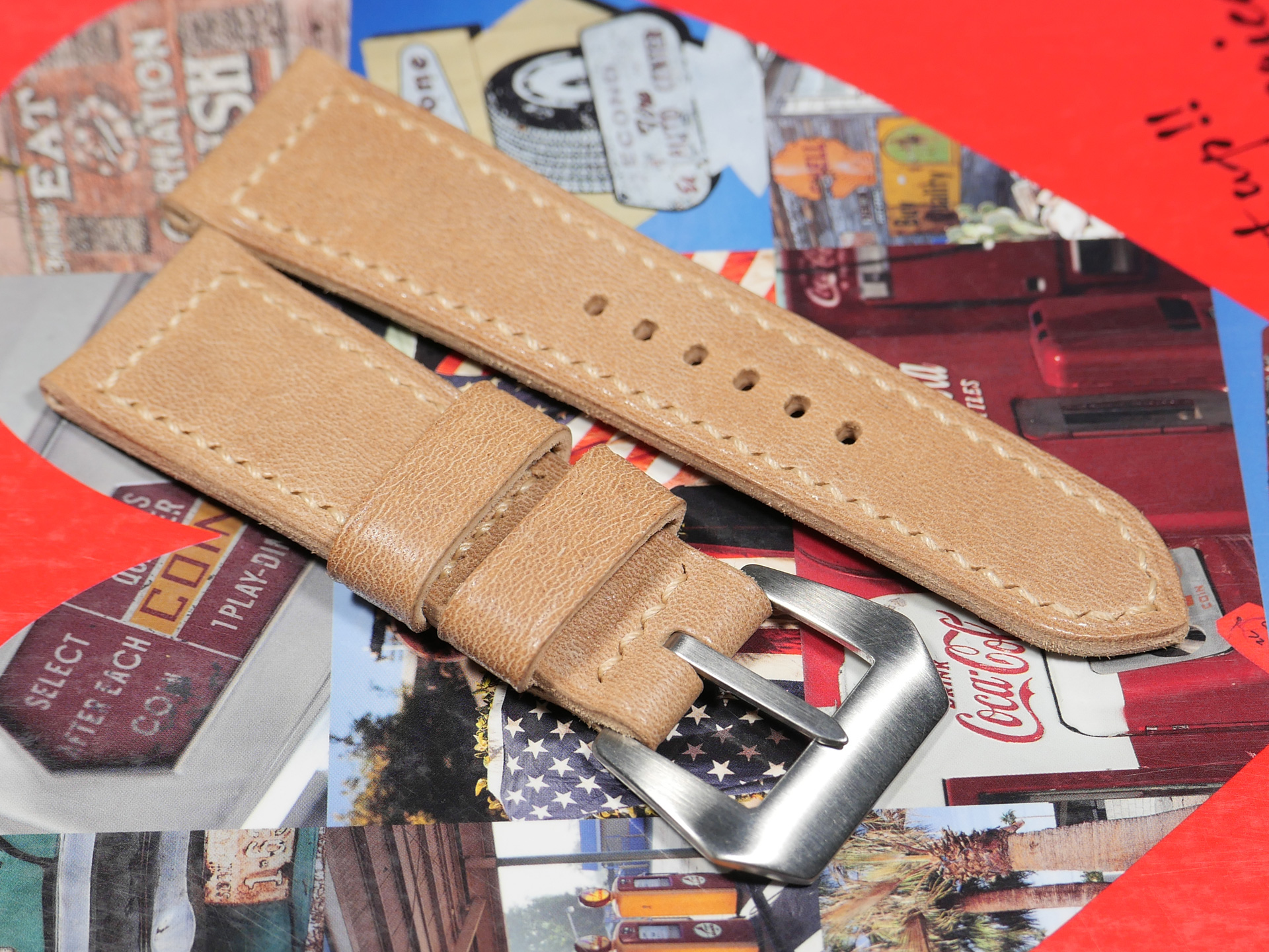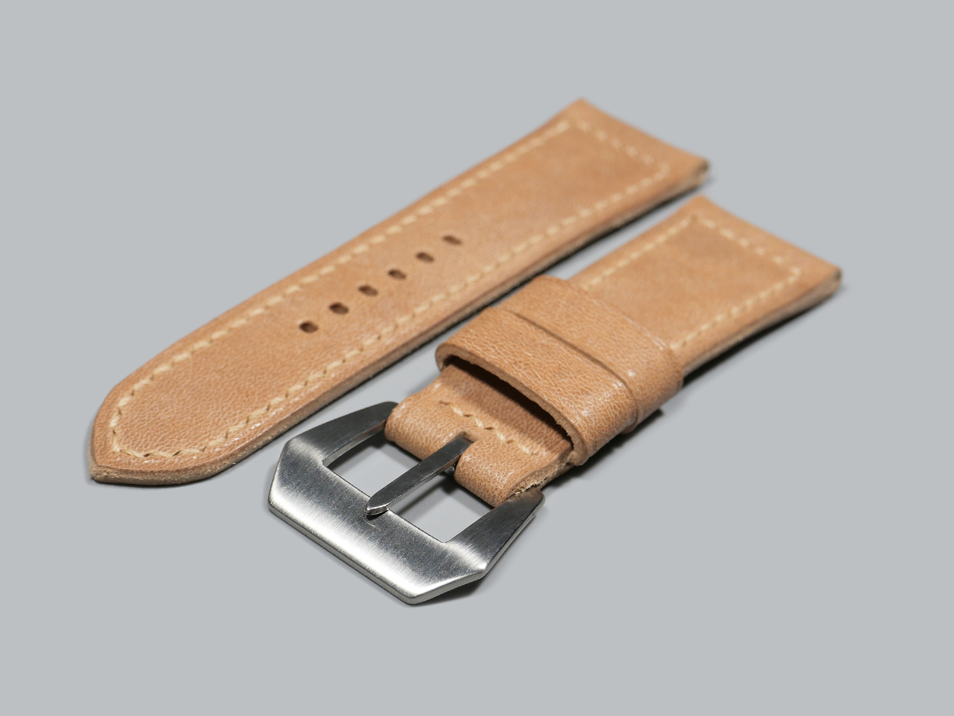 About the Leather: *Limited to 5 pieces due to scarce leather. I assembled this beige Panerai Radiomir strap 100% by hand and hand stitched it, as with all of my straps. I selected for this project a premium chrome tanned leather with a medium light beige tone. This light tan Radiomir strap is of a soft rigidity and features gently creased edges. Additionally, the strap implements two keepers; one floating and one fixed. I selected a light beige thread for the stitching.