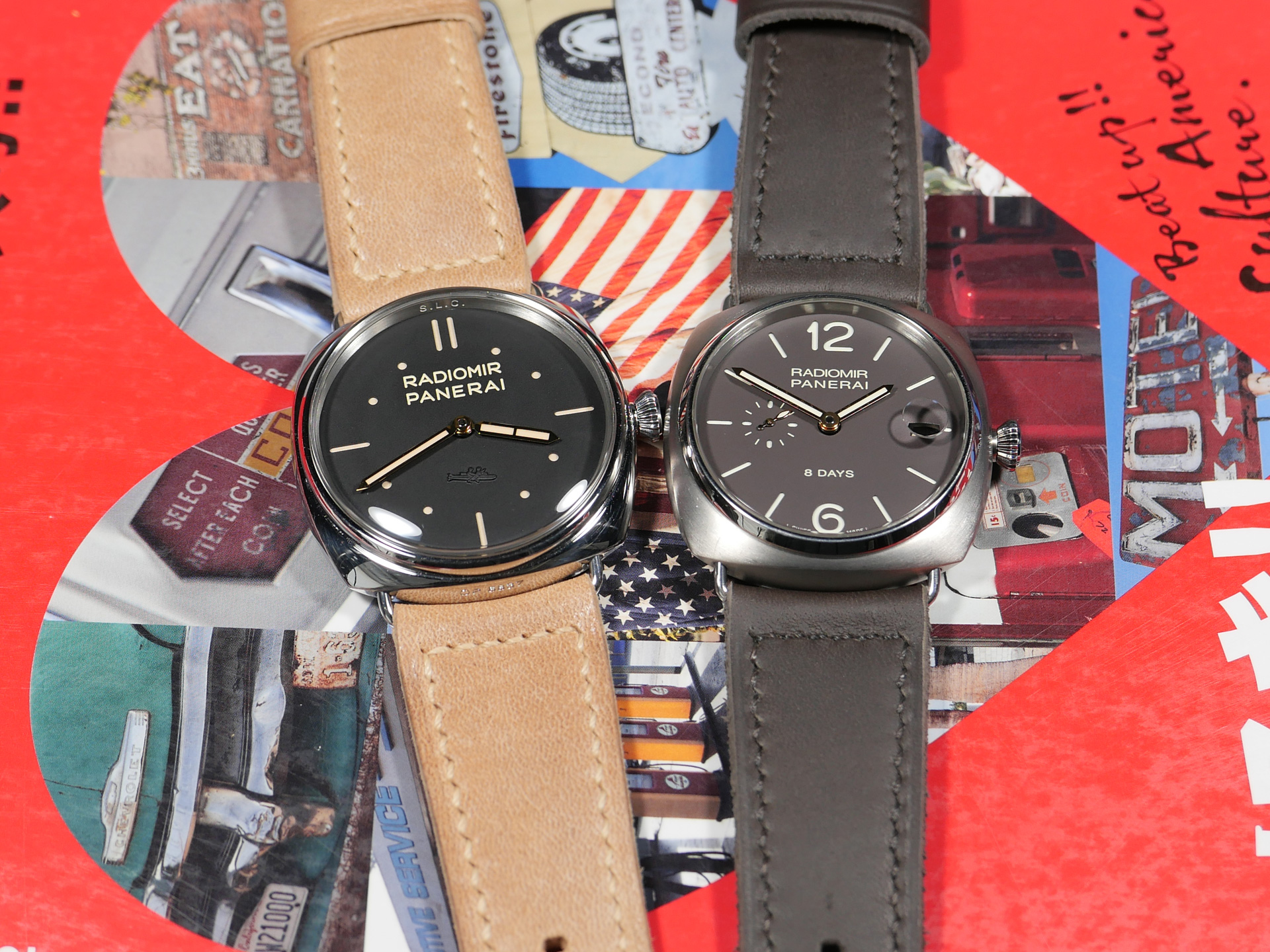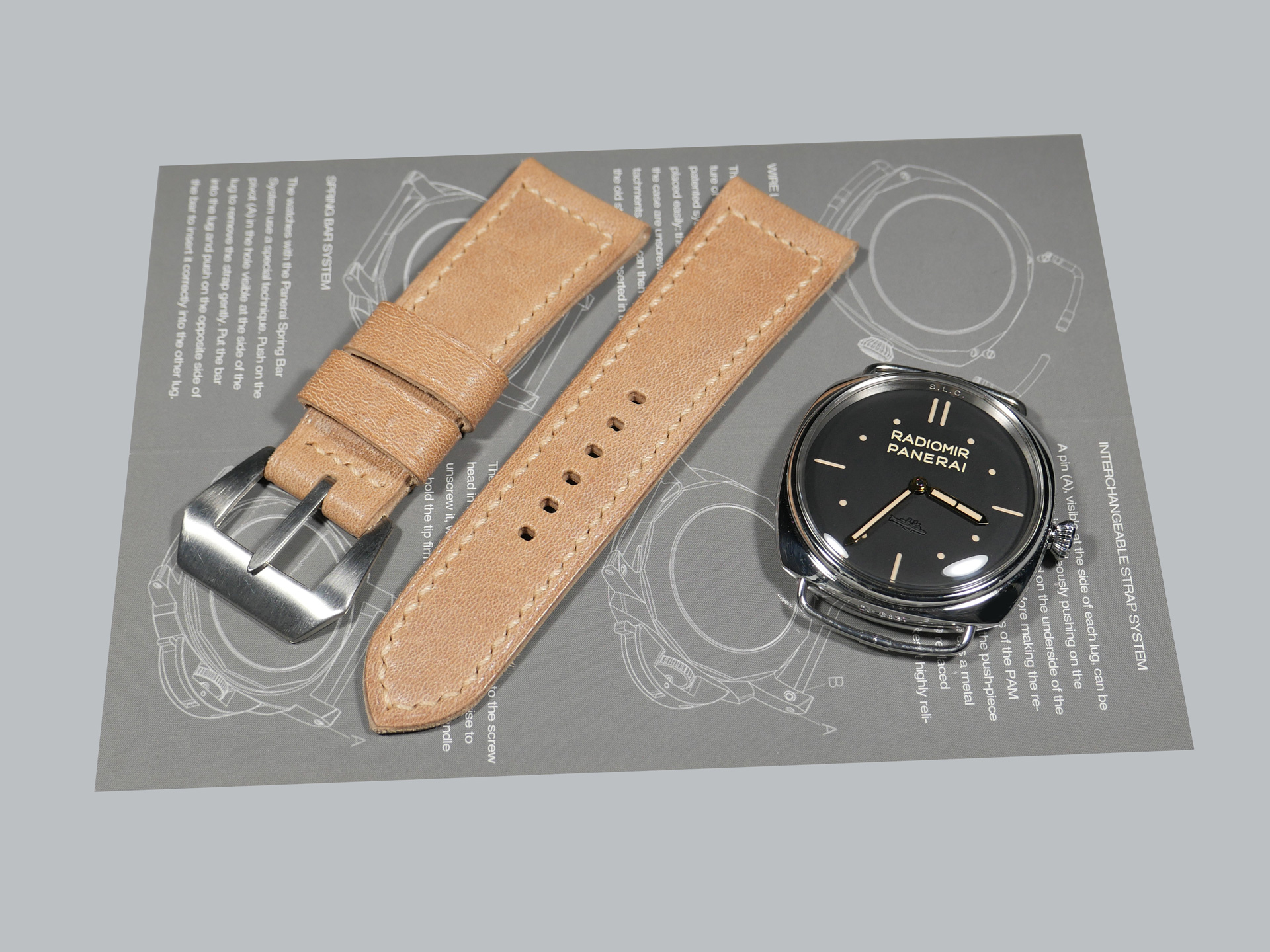Due to the wire lugs of the typical Panerai Radiomir case, I tend to lean towards leathers of a slightly softer and more pliable temper. From a design perspective, I tend to utilize a taper of 27-22 or 26-22 depending on the leather. If you have a larger 47mm Radiomir case, like a PAM323, I highly recommend going with straps of 4.5mm thickness or above. I have even designed some custom aftermarket Radiomir straps specifically for the 47mm Radiomir cases that have a bolstered taper where the strap meets the case.