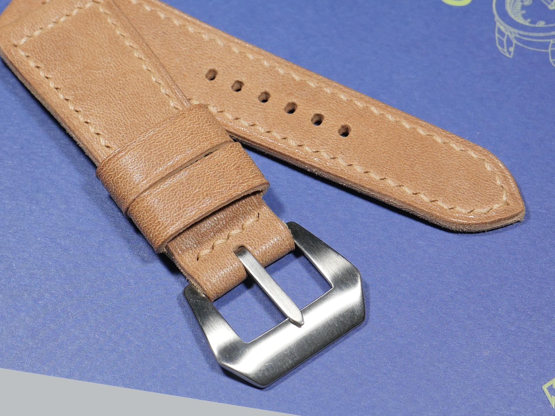 This strap ships with brushed stainless steel vintage style pin buckle as seen in the pictures. This creamy light tan Panerai strap is pictured above with the Radiomir PAM00425. In addition, thanks to the attractive color, this strap will pair well with pretty much any dial color. As with any light colored strap, you should avoid exposing this strap to harsh chemicals or liquids. This awesome beige Panerai strap combines a gorgeous and thin profile with a soft and very comfortable texture.