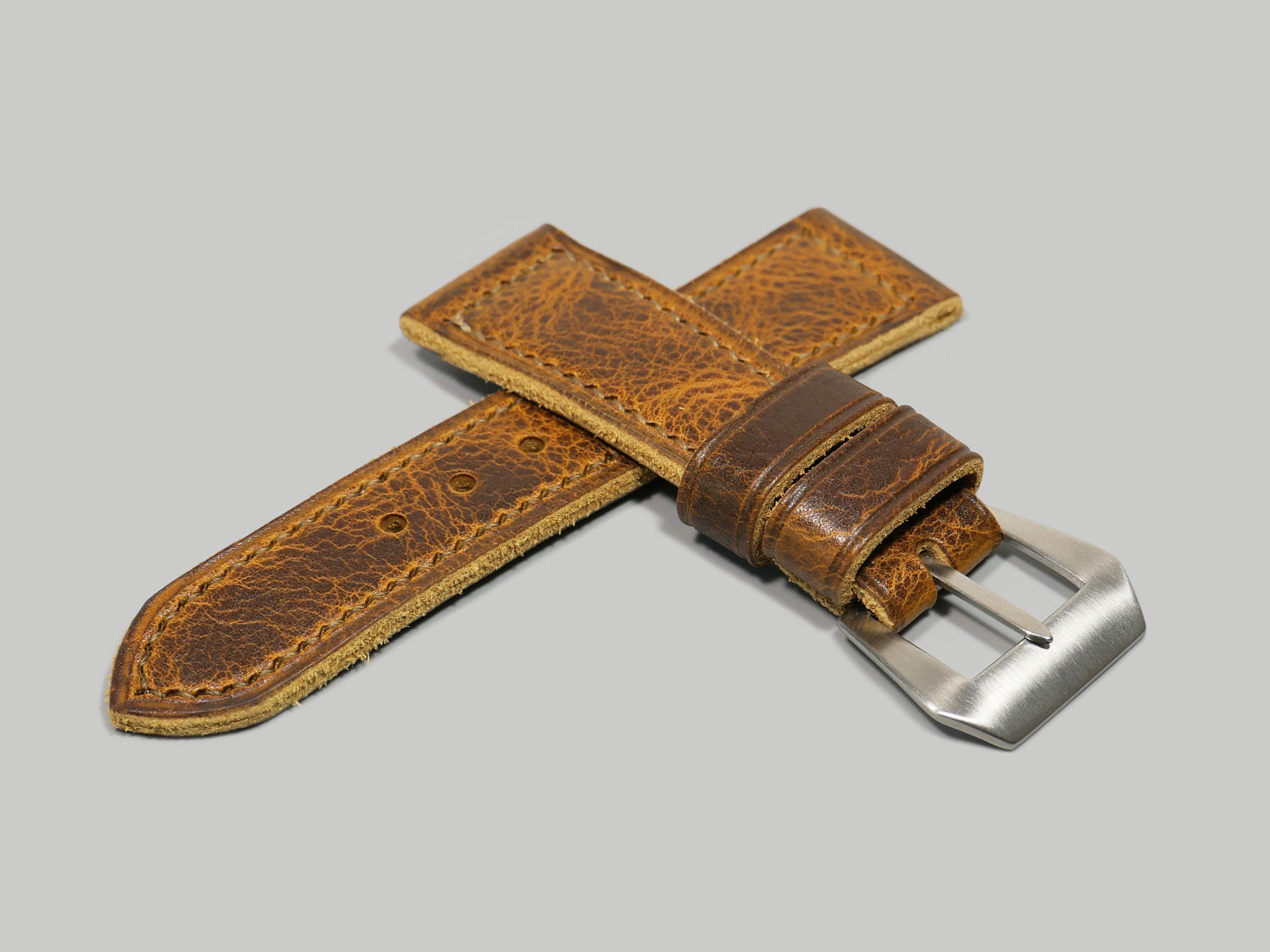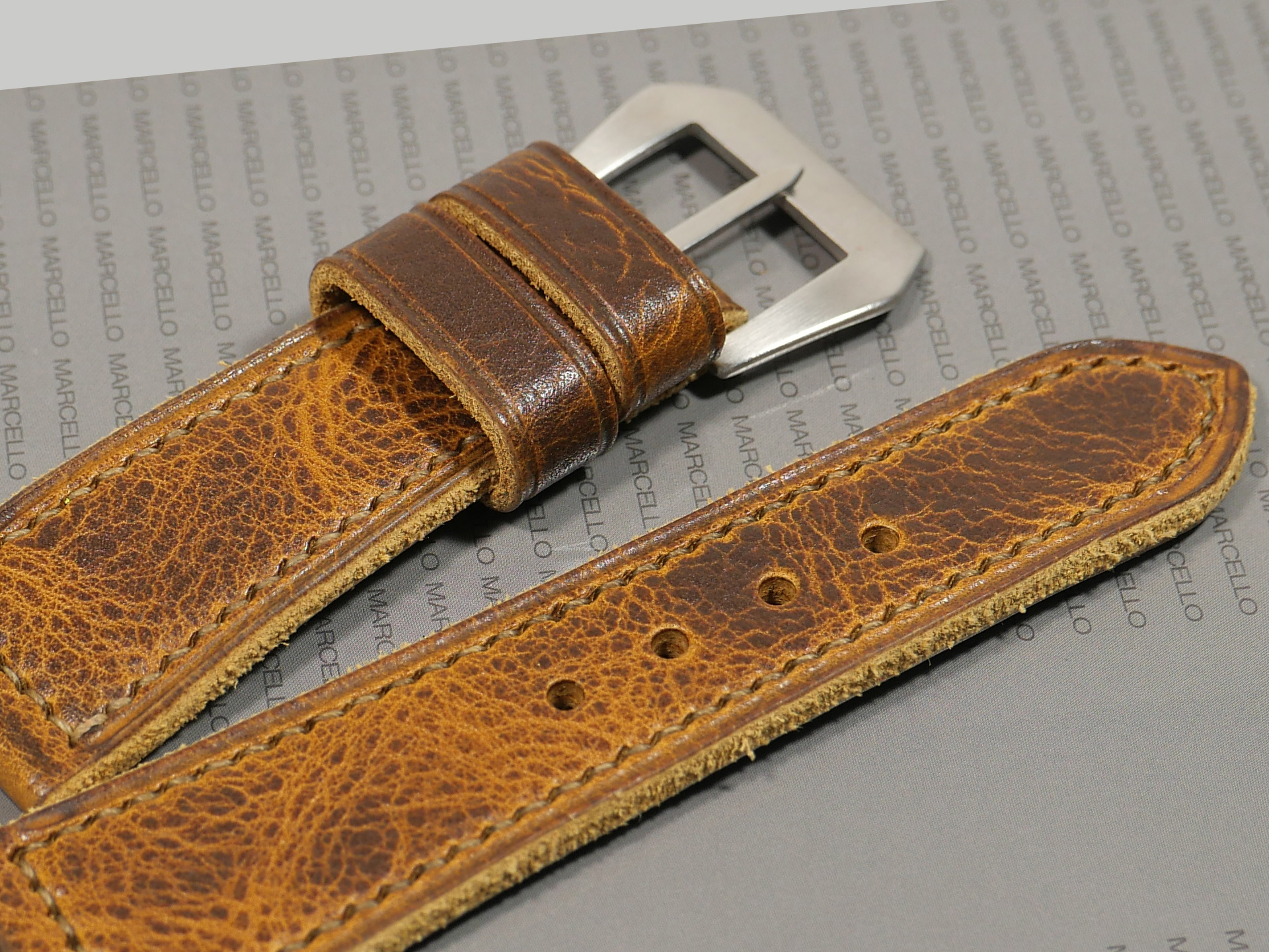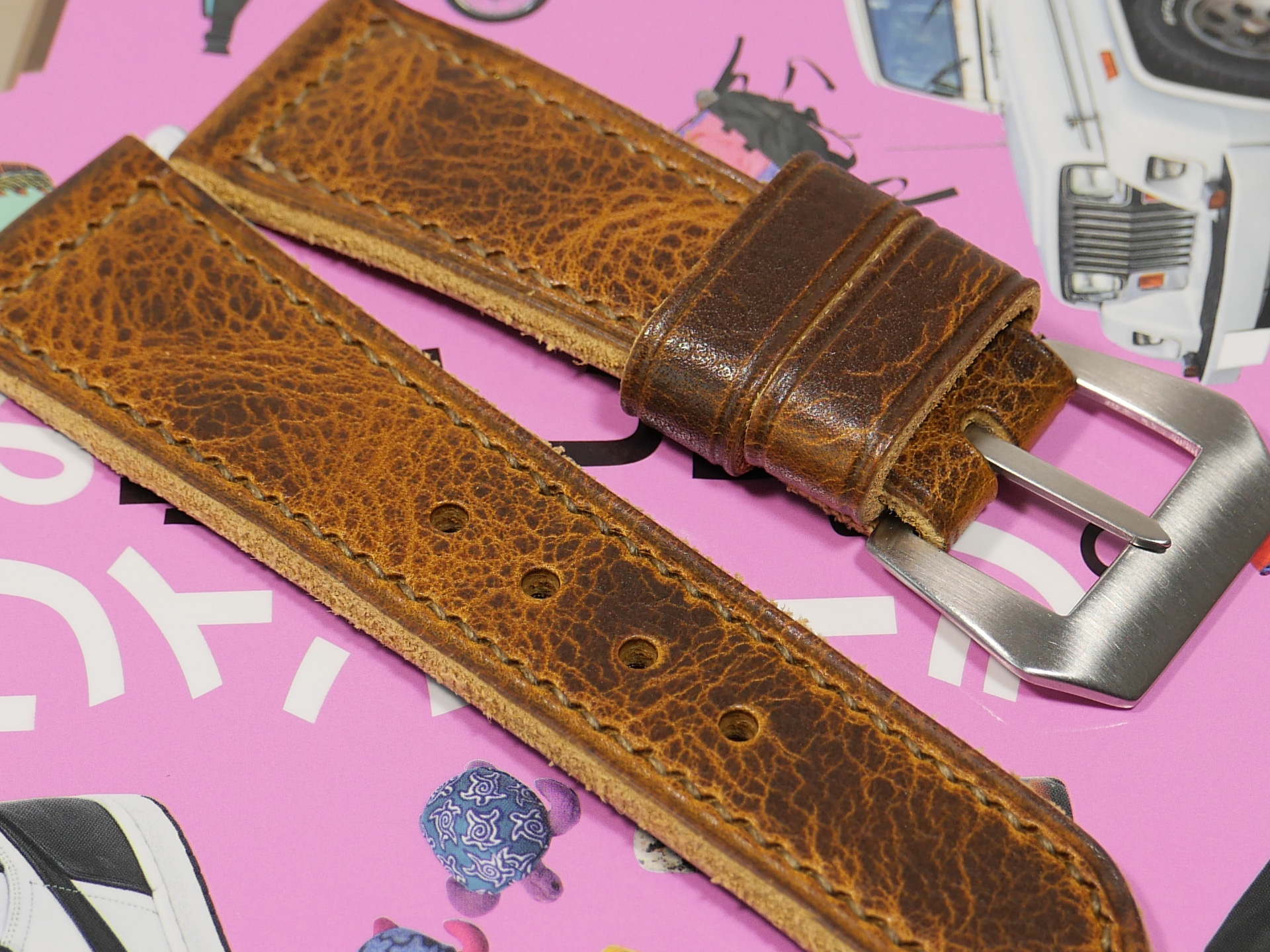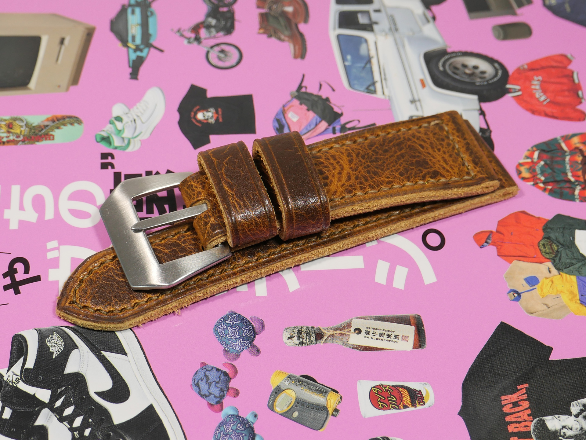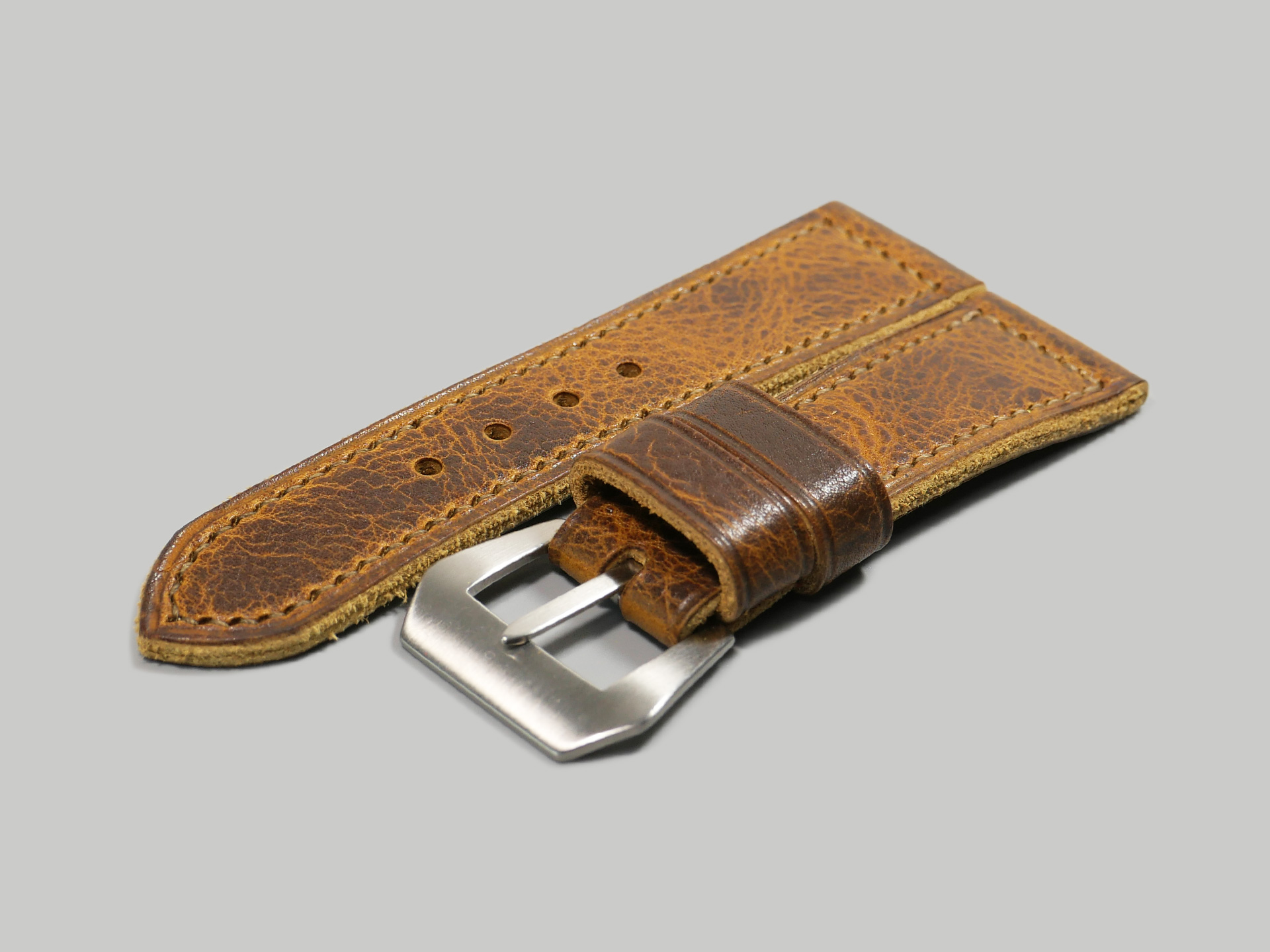About the Leather: This rugged handmade soft Panerai Radiomir strap is full of texture and character. Made from soft chrome-tanned leather that ranges in tone from brown to honey. This strap is extremely soft and comfortable on the wrist. I selected a beige thread for the stitching. This handmade soft Panerai Radiomir strap features one floating keeper and one fixed. The strap also showcases a soft crease along its edges. Additionally, this strap features a line of stitching at the buckle.