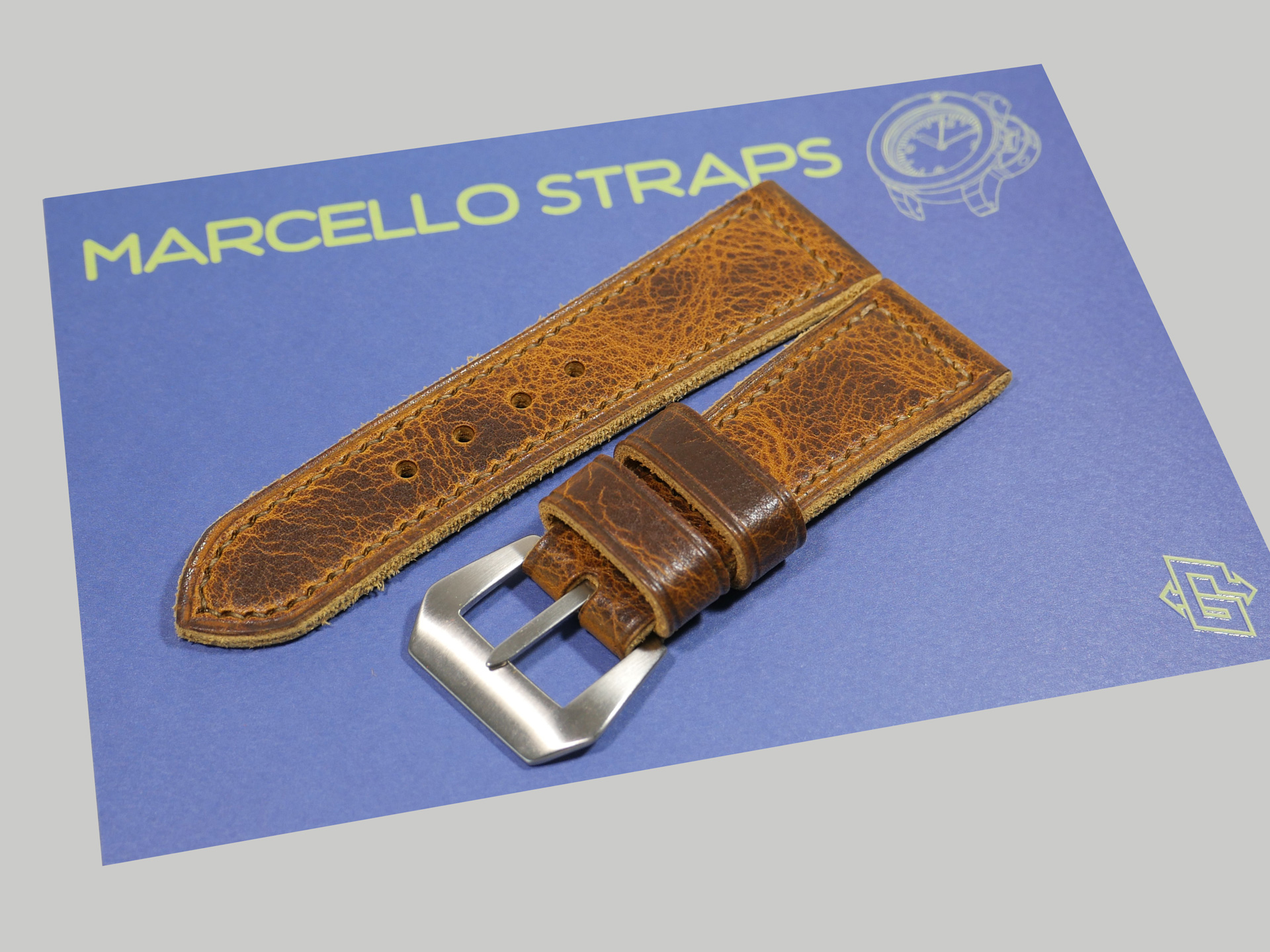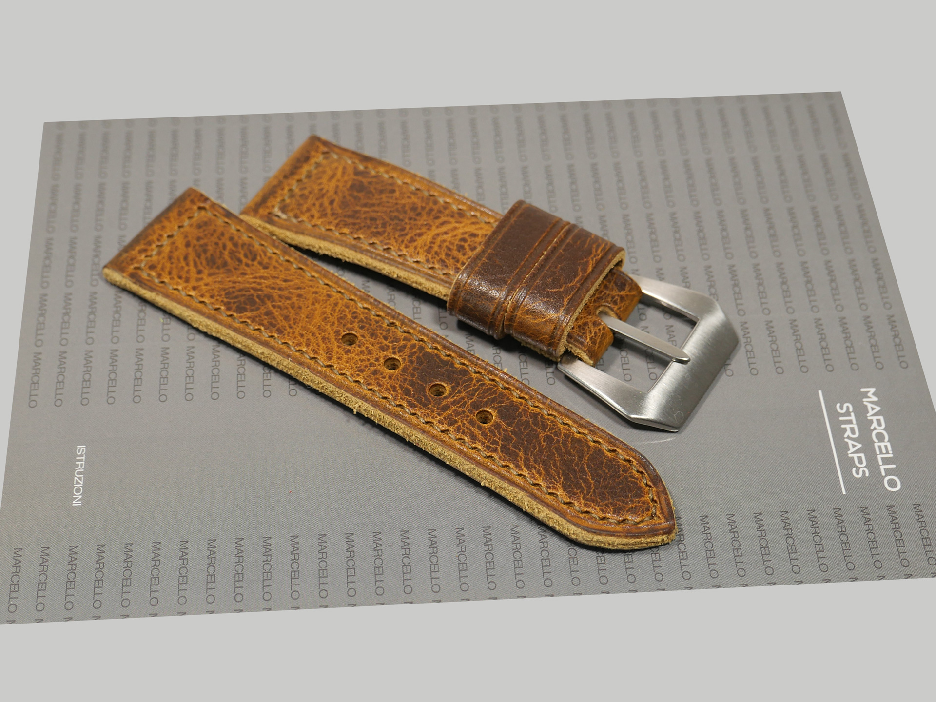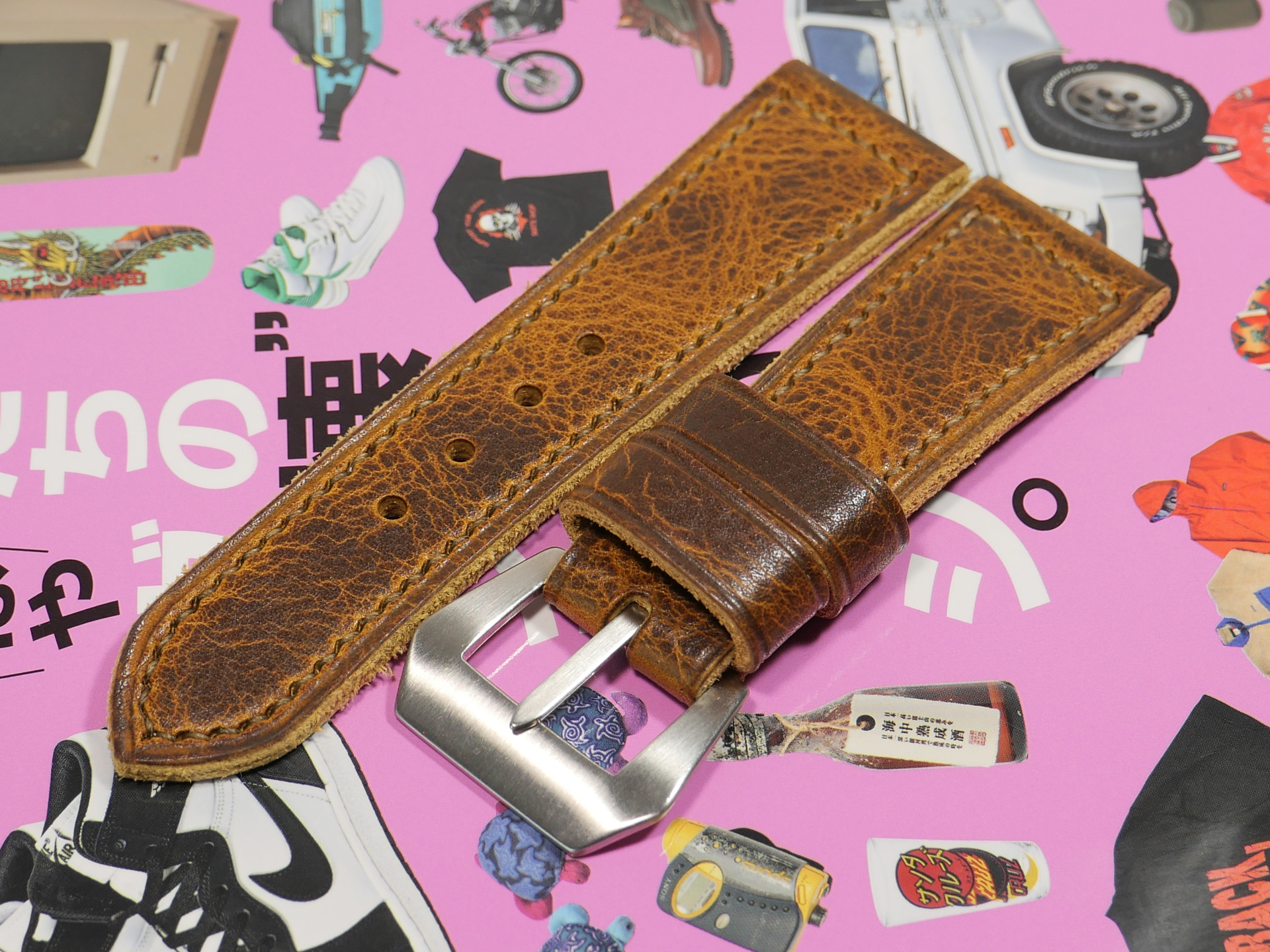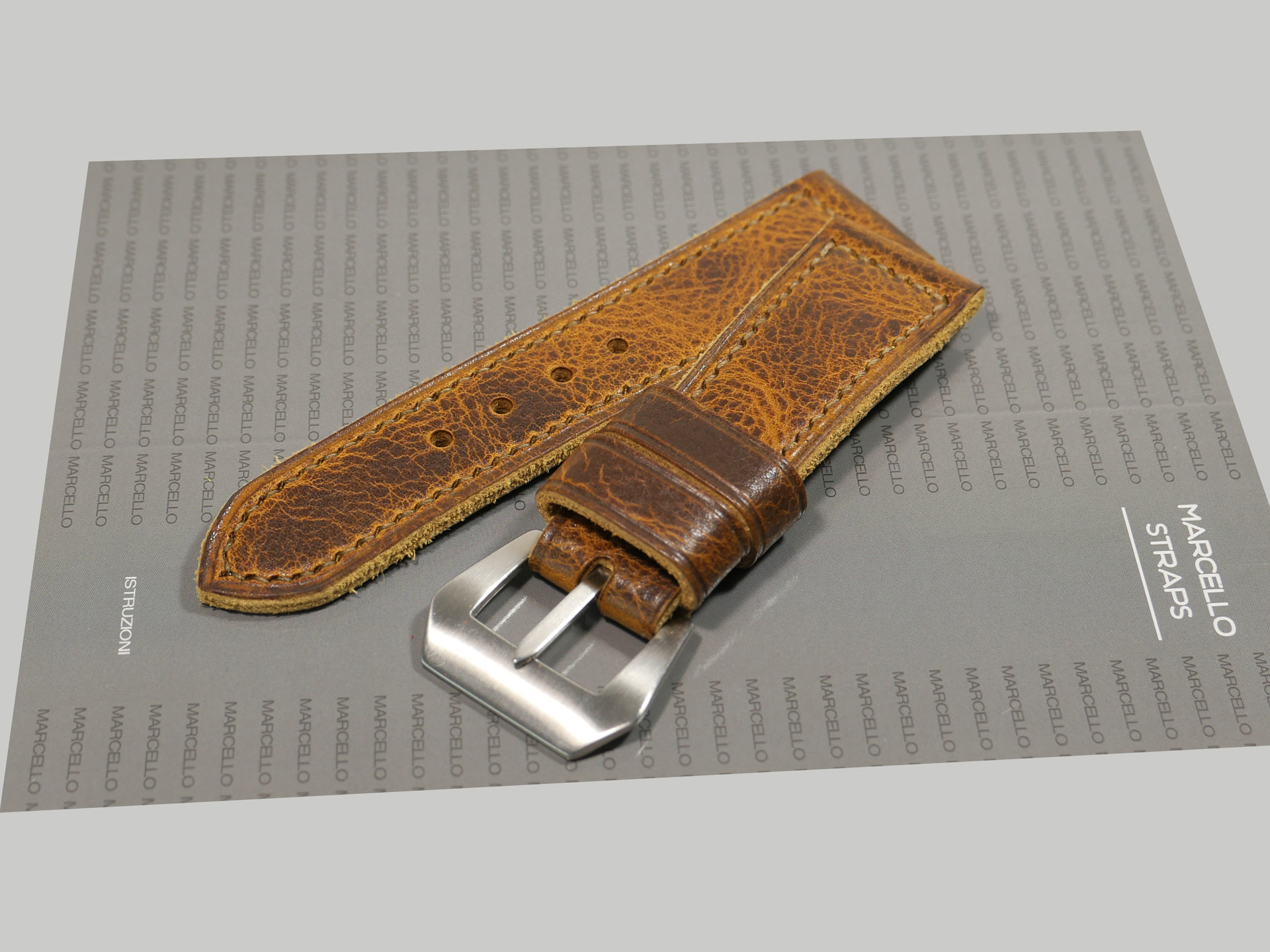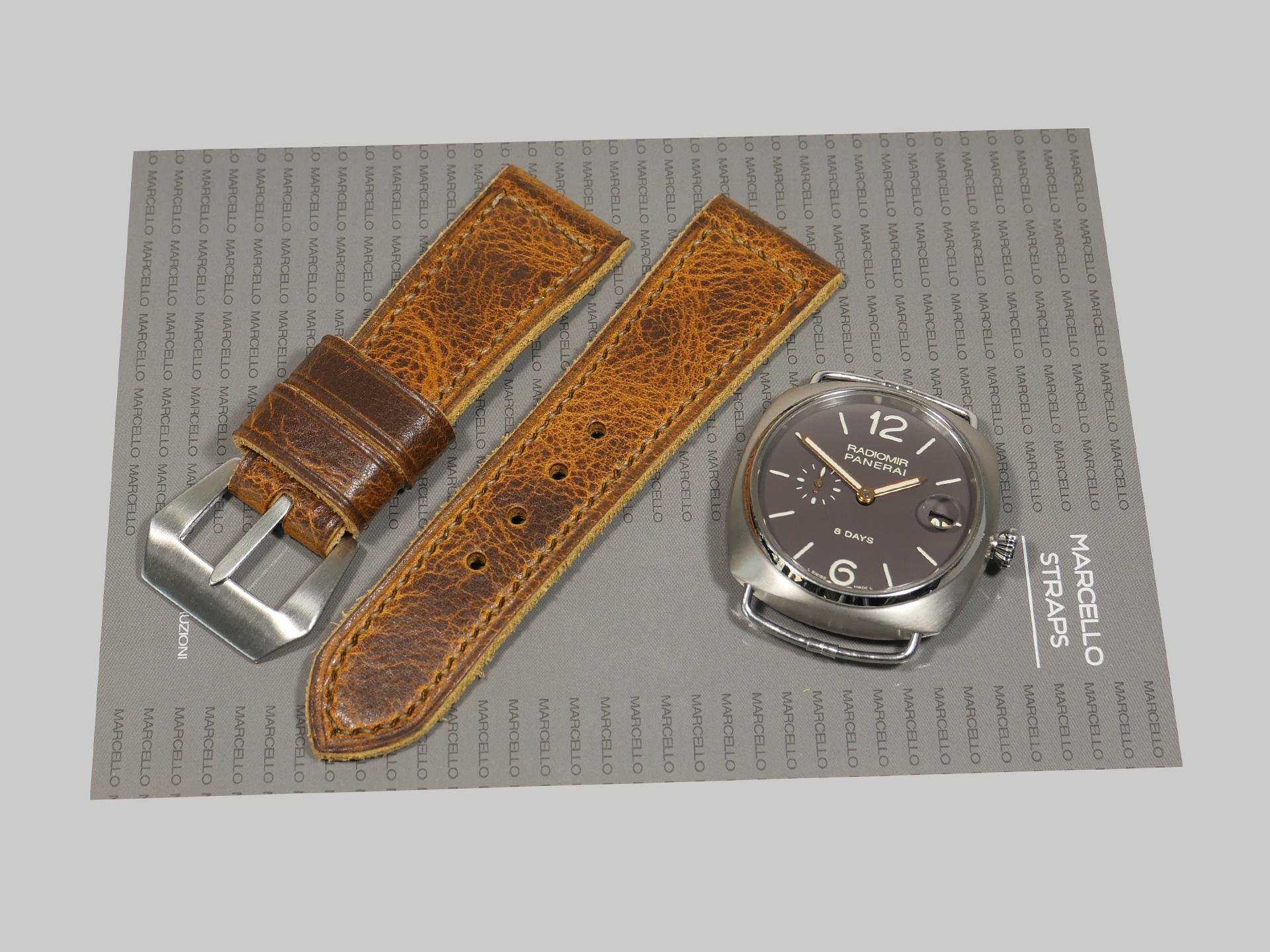 About the Leather: This rugged handmade soft Panerai Radiomir strap is full of texture and character. Made from soft chrome-tanned leather that ranges in tone from brown to honey. This strap is extremely soft and comfortable on the wrist. I selected a beige thread for the stitching. This handmade soft Panerai Radiomir strap features one floating keeper and one fixed. The strap also showcases a soft crease along its edges. Additionally, this strap features a line of stitching at the buckle.
