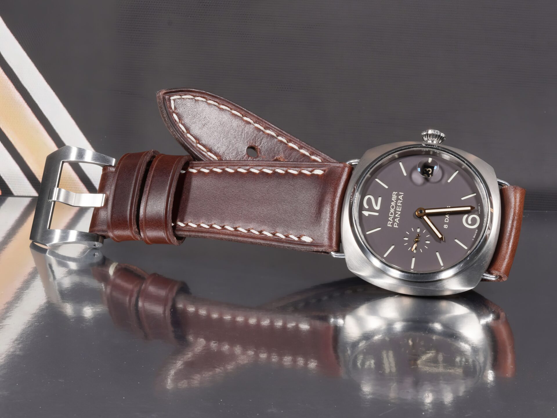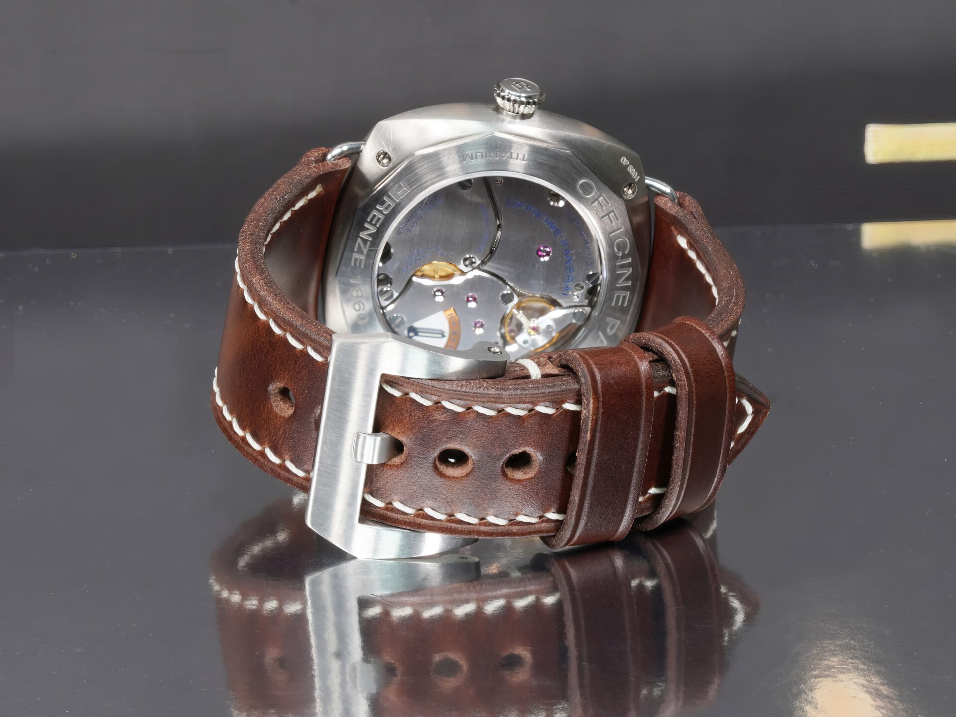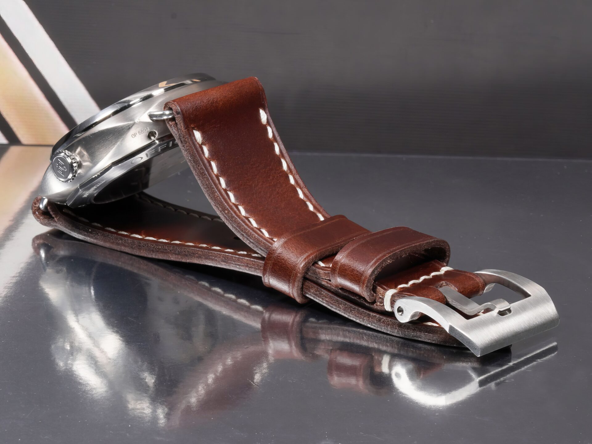 About the Leather: This strap is made from dark brown chrome-tanned leather with pronounced pull-up character, giving the surface natural movement and tonal variation as it flexes on the wrist. The color stays deep and understated, with lighter highlights emerging only through wear—exactly how a proper Panerai strap should age.