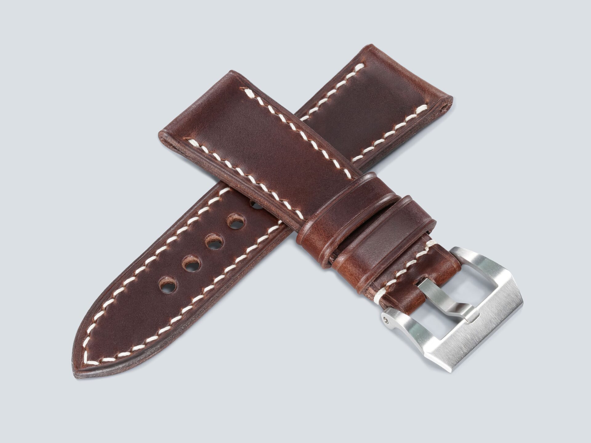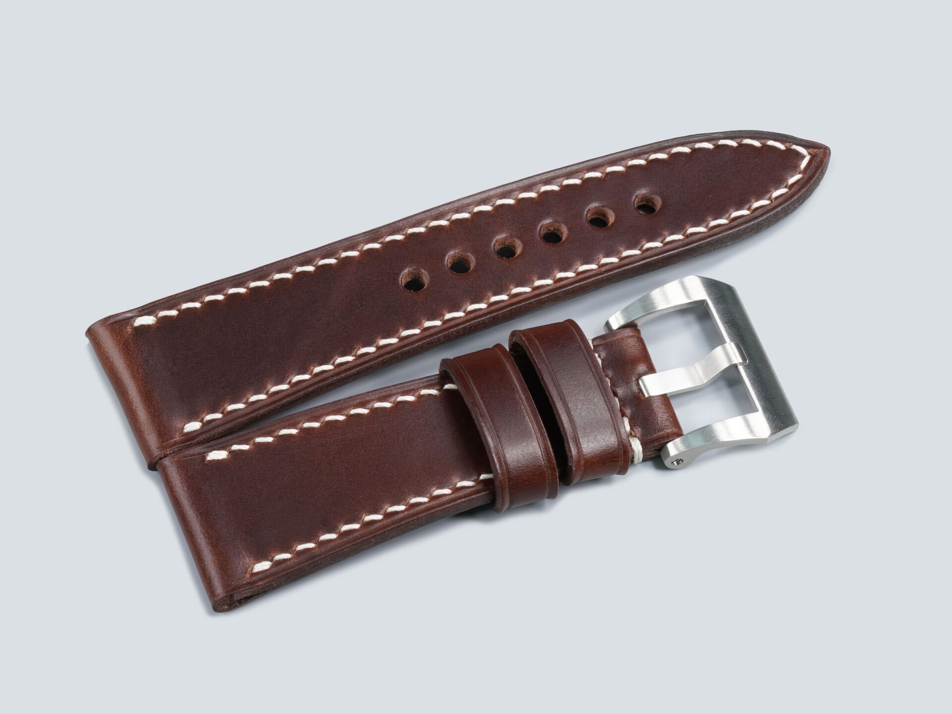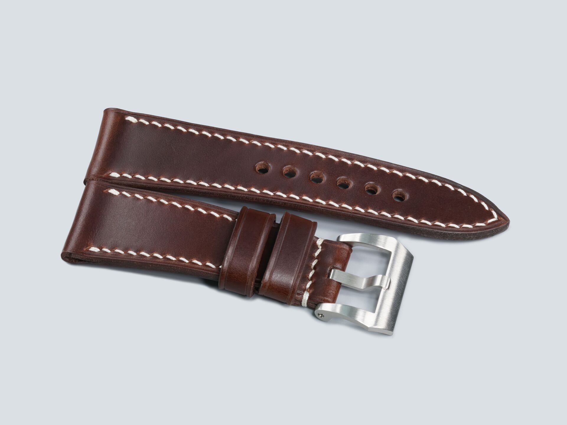 For larger 47mm Panerai cases, I typically use thicker thread with wider spacing. The Radiomir requires a more nuanced approach. In the Burgundy Radiomir Strap, I mix thicker and finer threads and vary stitch spacing based on the leather. Most of my custom Radiomir straps measure between 3.5 and 5.0 mm thick, with the average falling near the middle of that range.