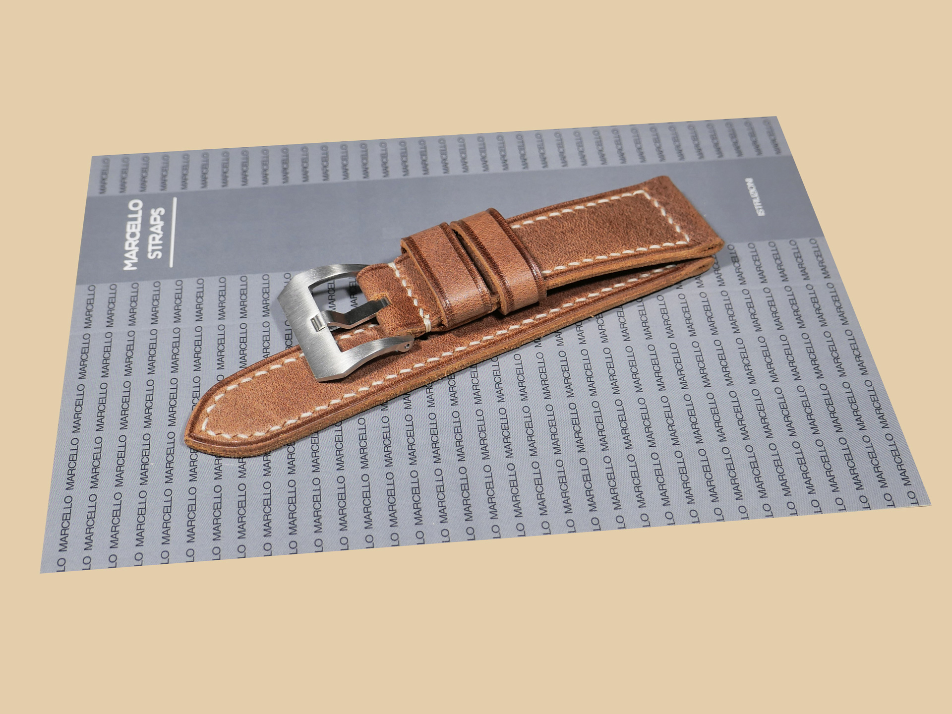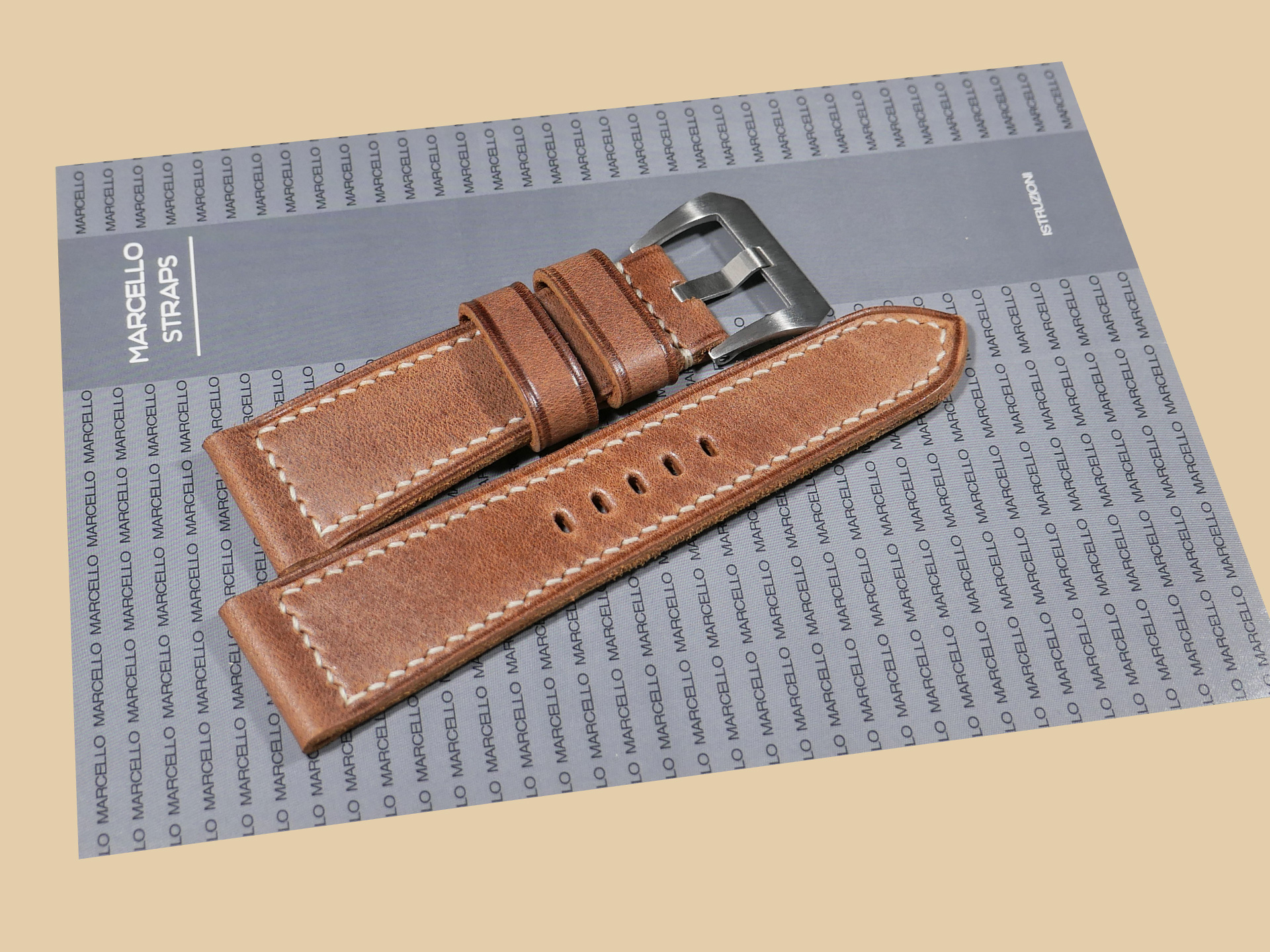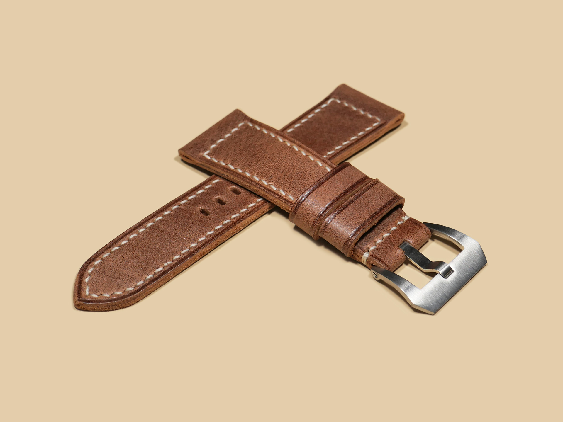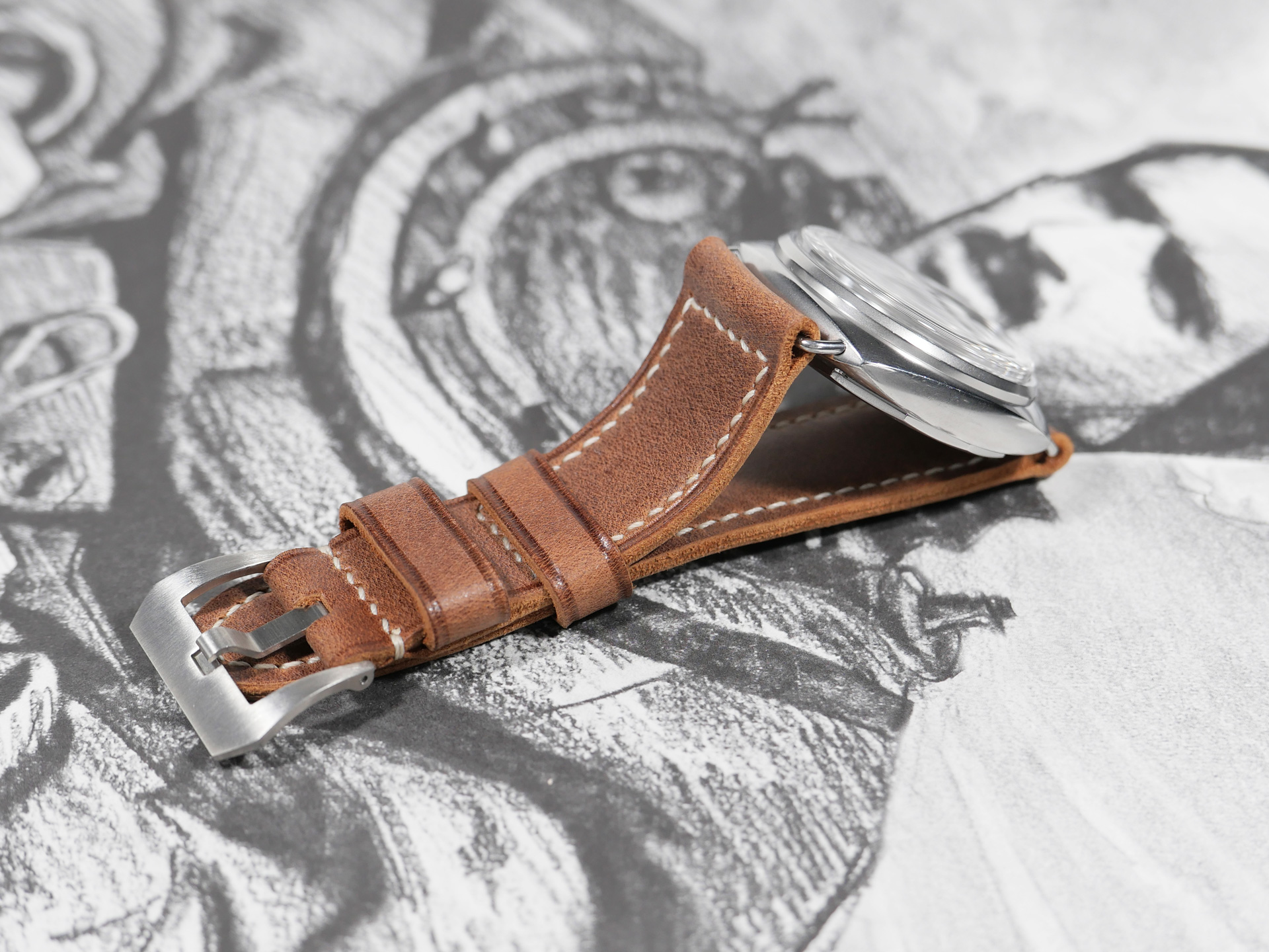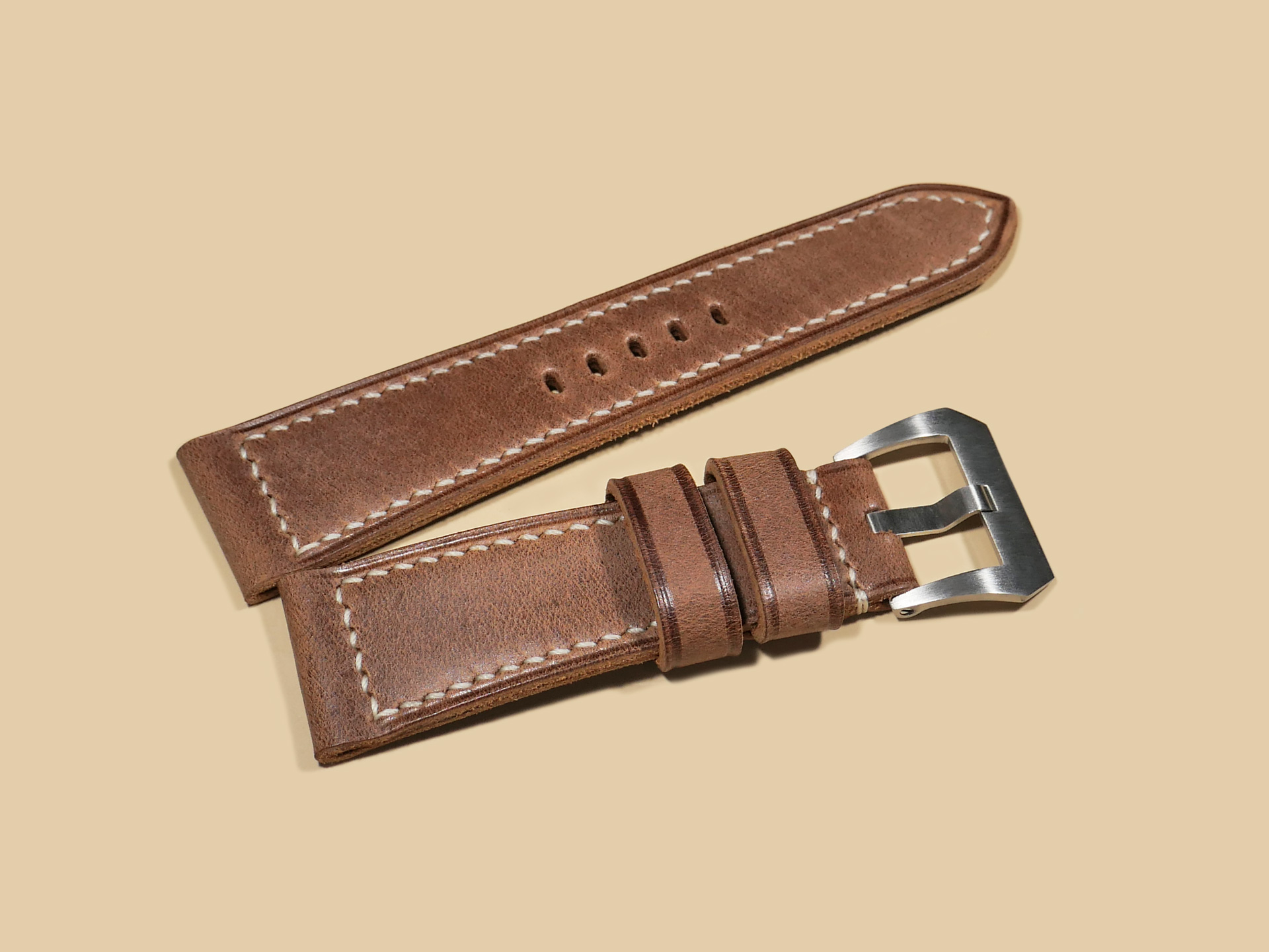 About the Leather: This clay brown Radiomir strap was entirely handmade and hand-stitched, like all of my straps. The leather features a distinctive finish with natural fat lines and deep grain creases, giving each strap a unique appearance. Slim in profile—much like an OEM strap—it fits comfortably under sleeves and has a medium-soft temper that allows it to conform easily to the wrist. A soft crease runs along the edges, adding a refined touch.