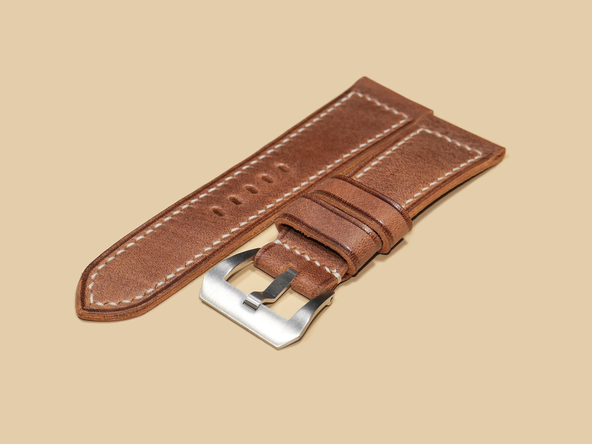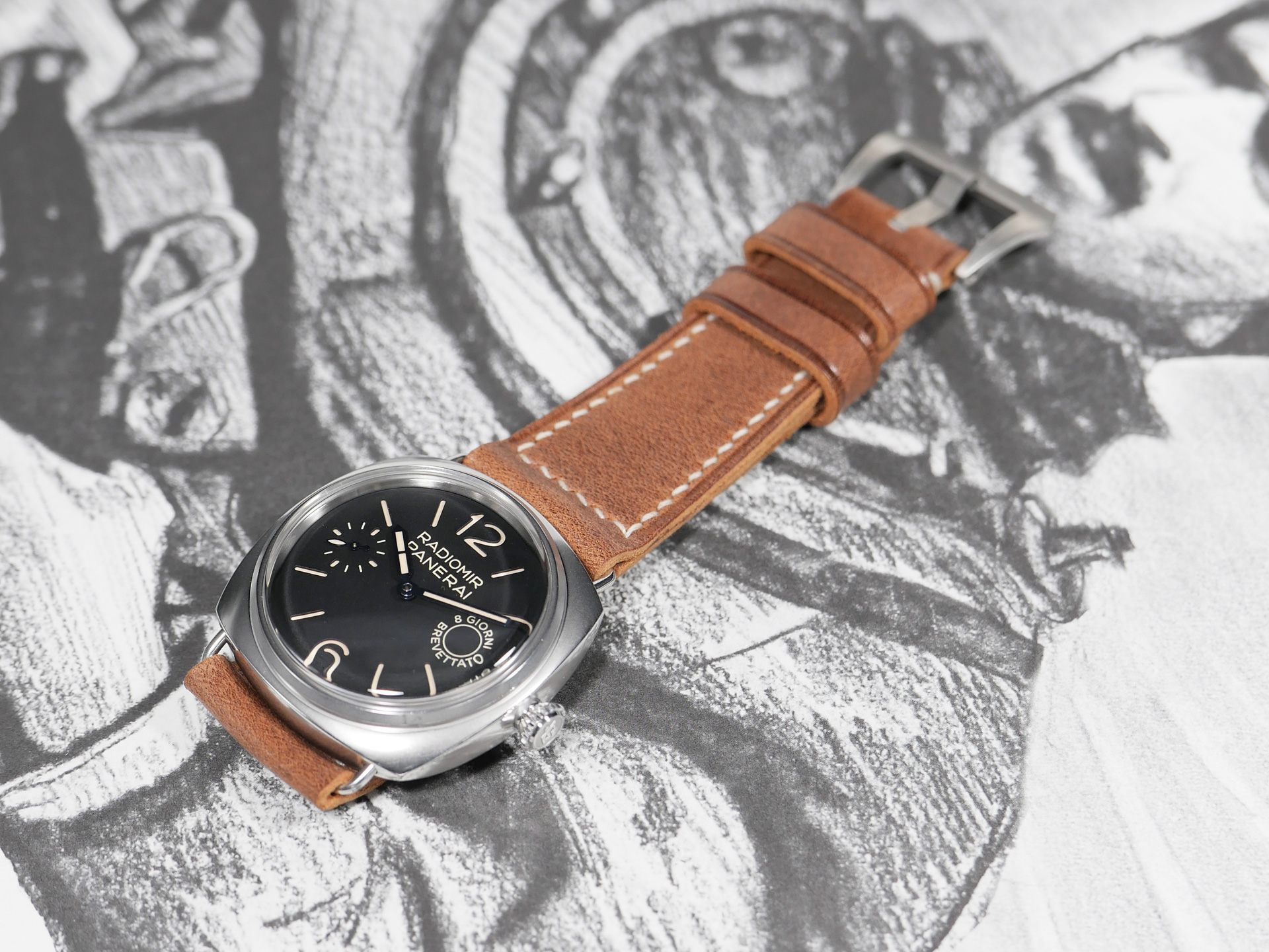 Due to the wire lugs of the typical Panerai Radiomir case, I tend to lean towards leathers of a slightly softer and more pliable temper. From a design perspective, I tend to utilize a taper of 27-22 or 26-22 depending on the leather. If you have a larger 47mm Radiomir case, like a PAM323, I highly recommend going with straps of 4.5mm thickness or above. I have even designed some custom aftermarket Radiomir straps specifically for the 47mm Radiomir cases that have a bolstered taper where the strap meets the case.