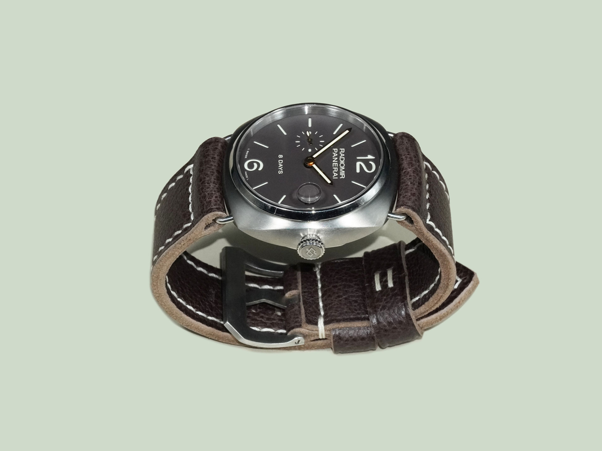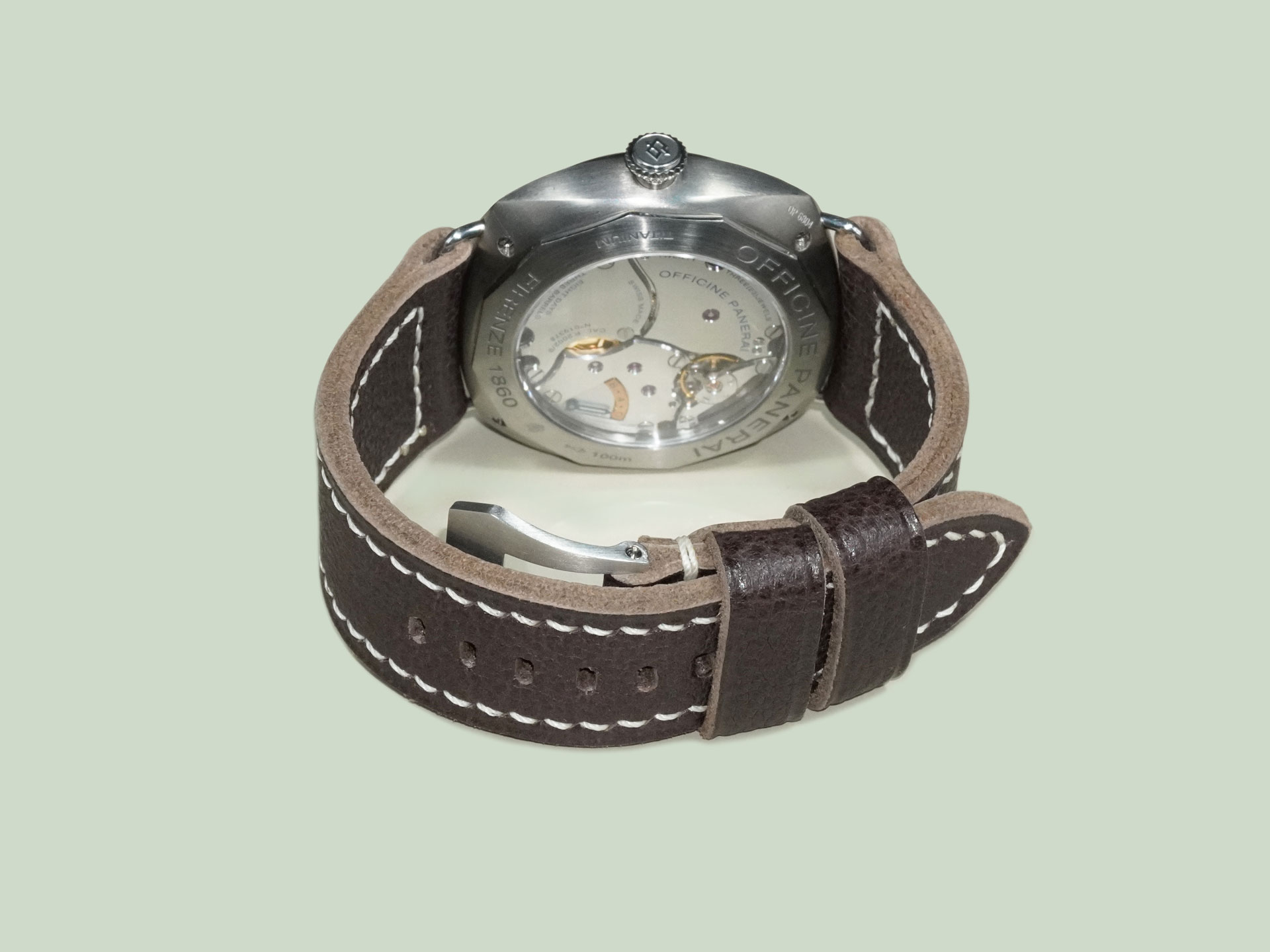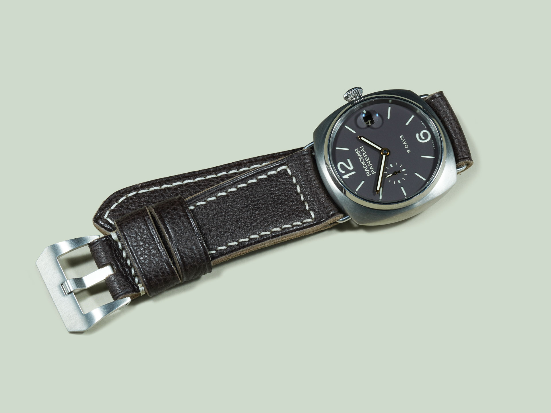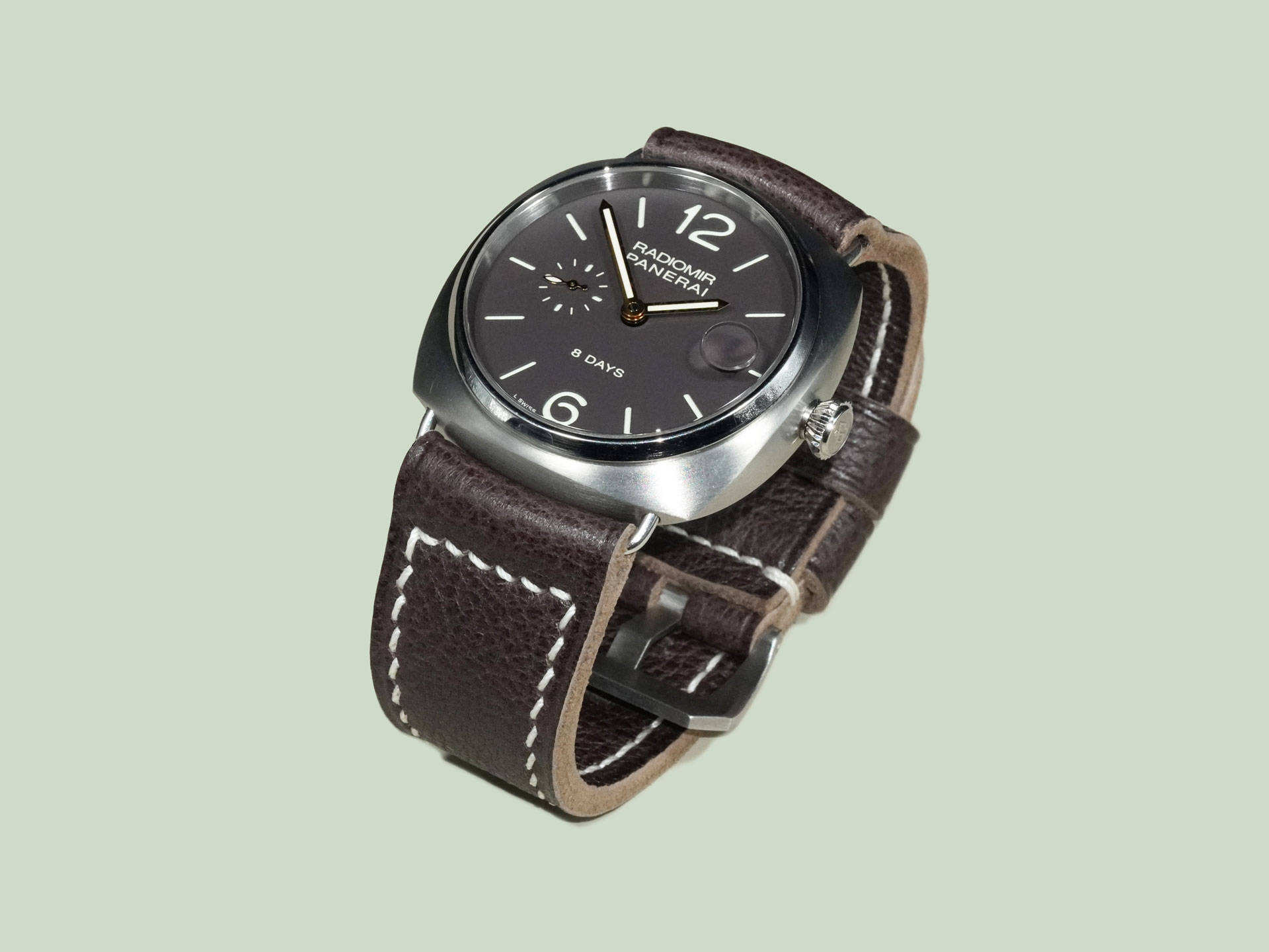 Displayed above on the PAM00346 Radiomir 8 Days Titanium. The neutral espresso tone pairs effortlessly with Radiomir references. As with all straps on my site, it can be ordered with or without a buckle. To pair it with your OEM buckle, simply select “No Buckle” at checkout.