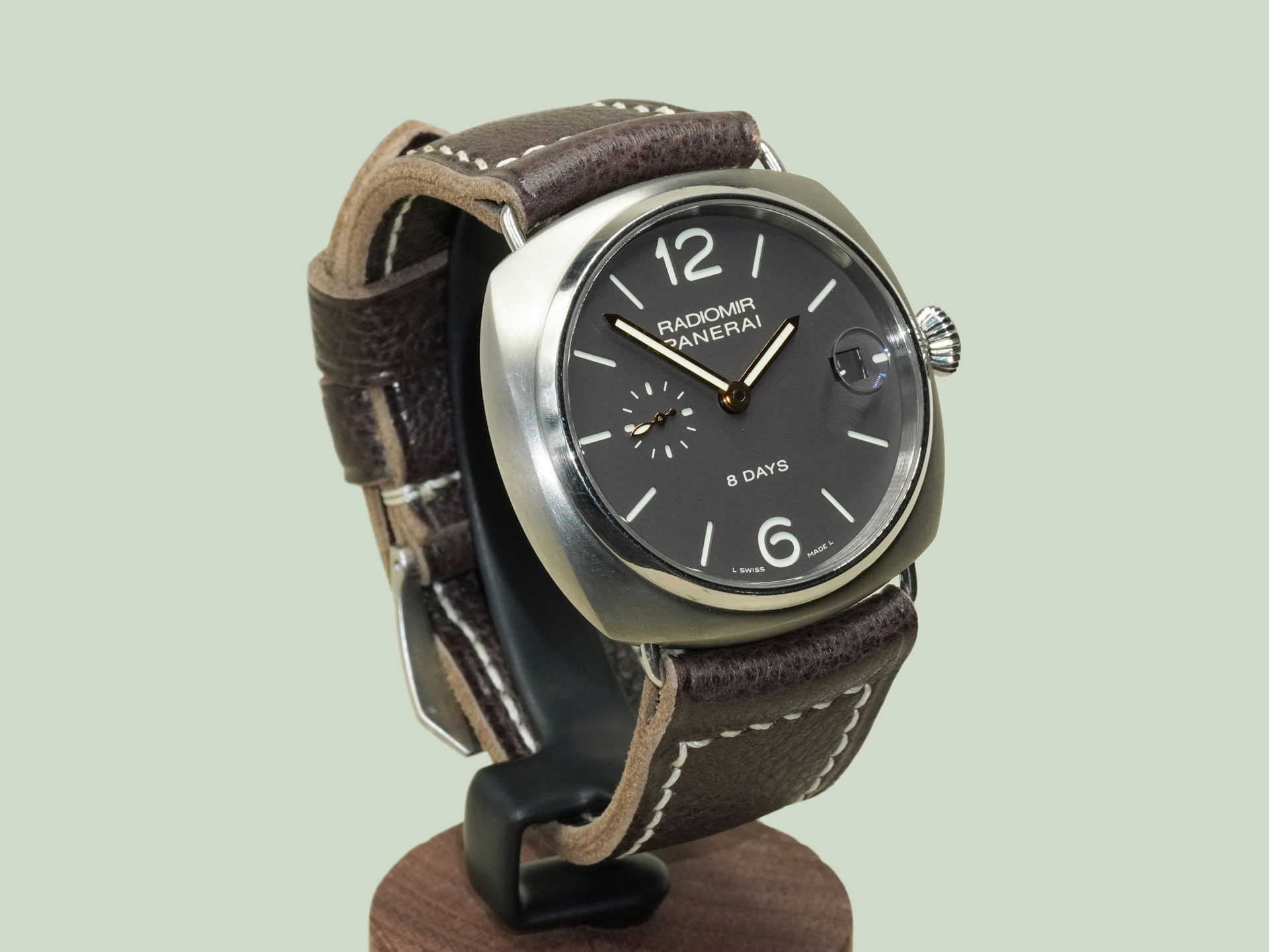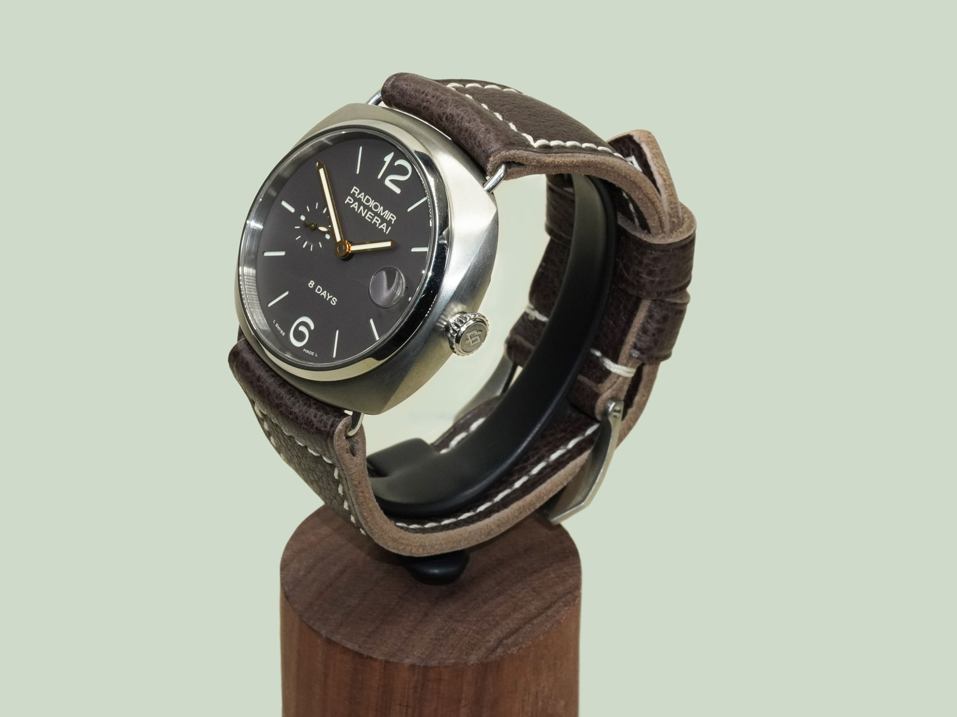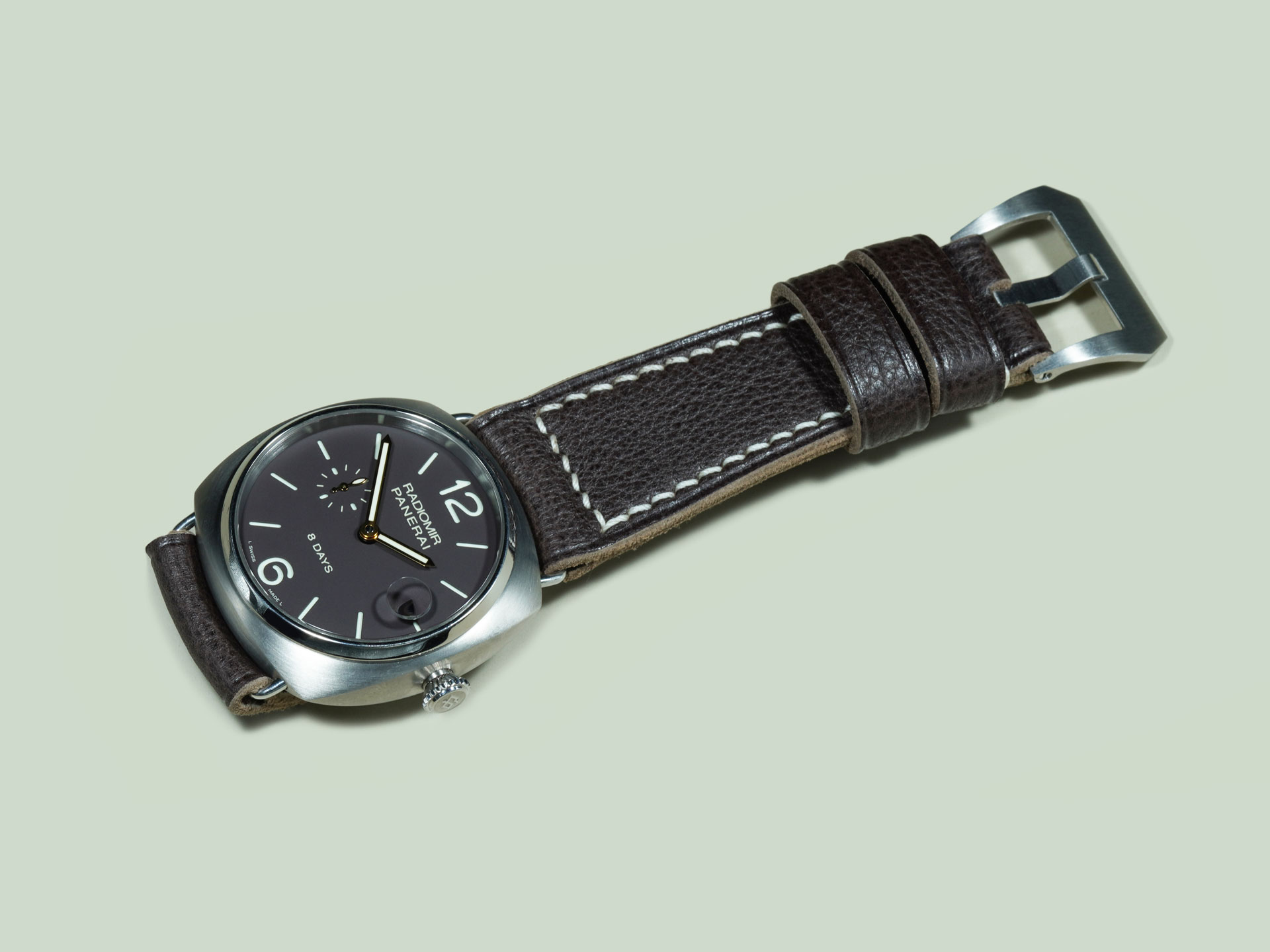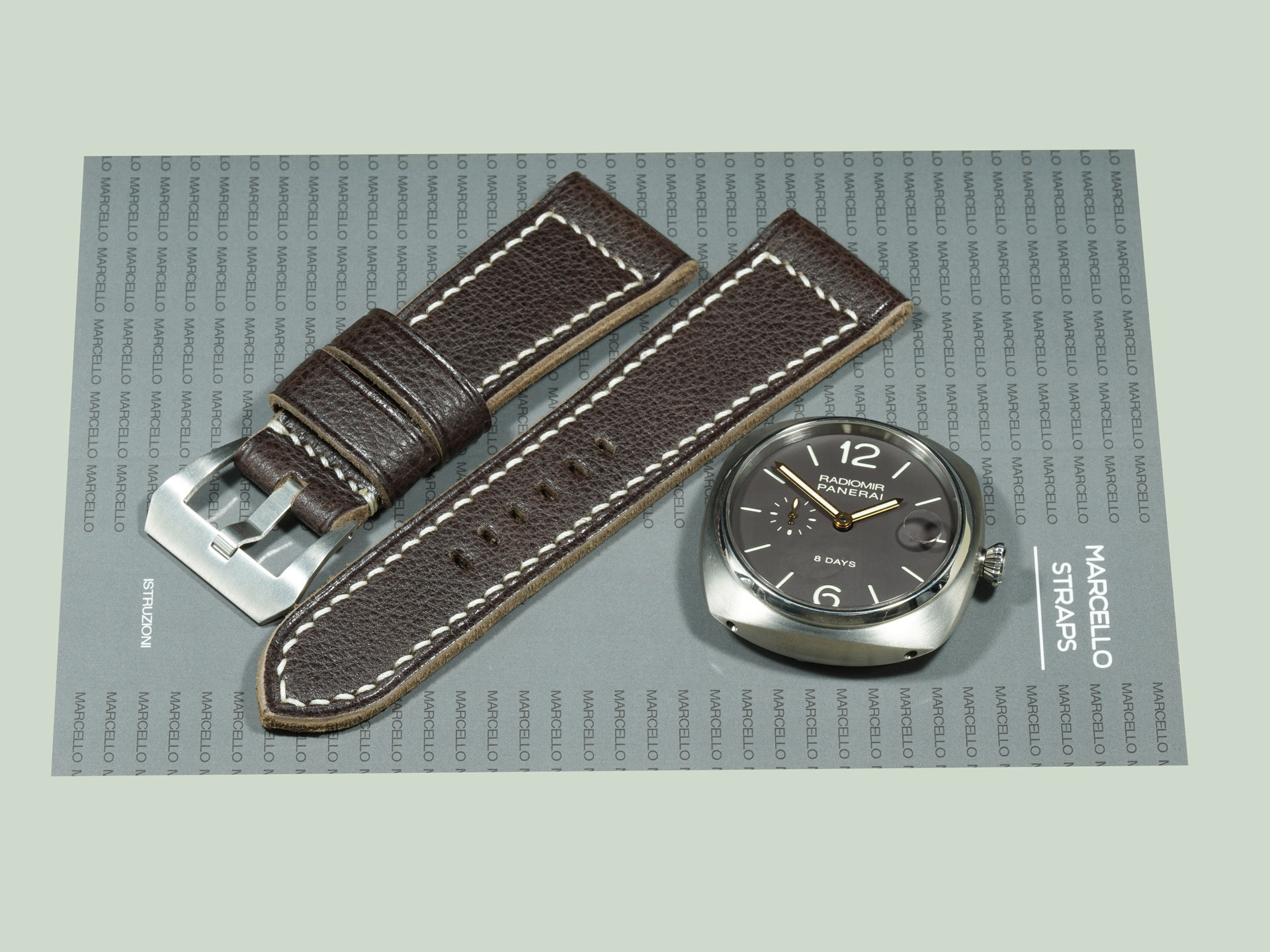 Displayed above on the PAM00346 Radiomir 8 Days Titanium. The neutral espresso tone pairs effortlessly with Radiomir references. As with all straps on my site, it can be ordered with or without a buckle. To pair it with your OEM buckle, simply select “No Buckle” at checkout.
