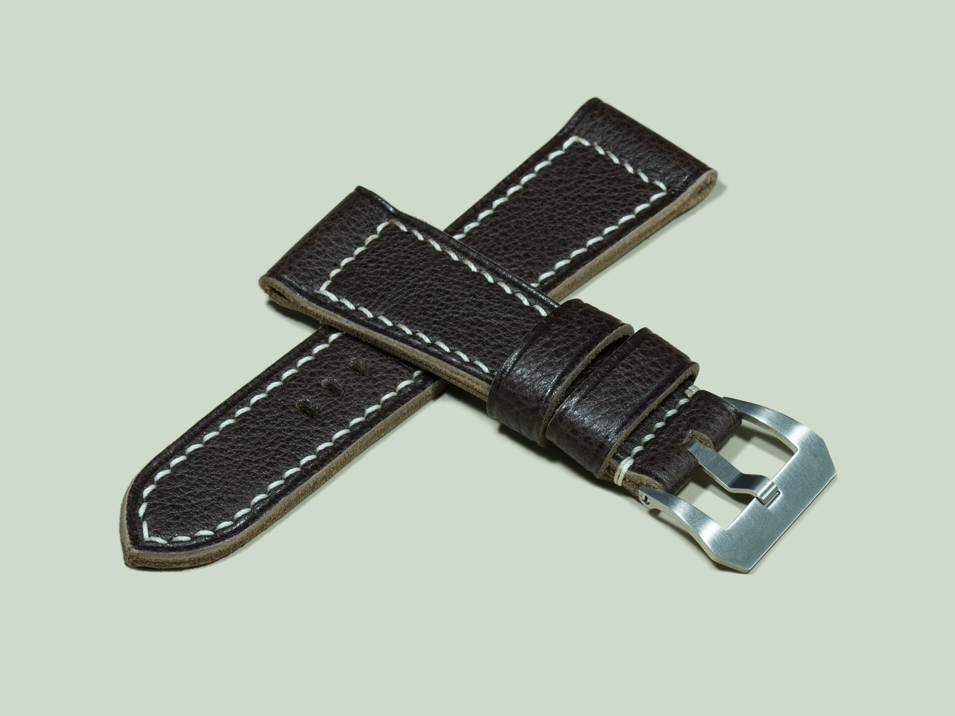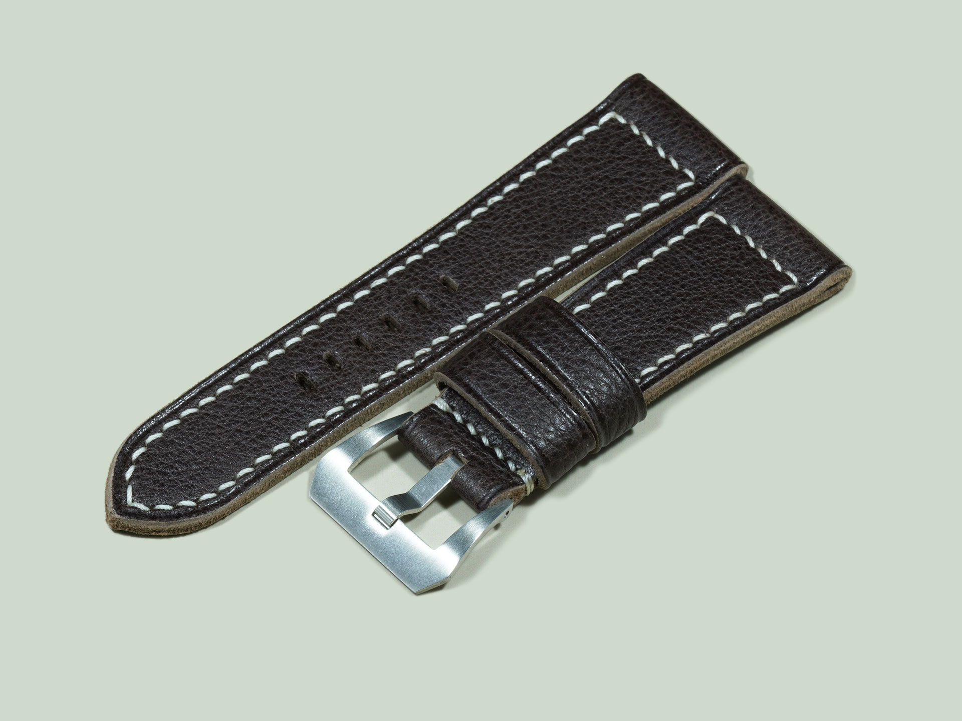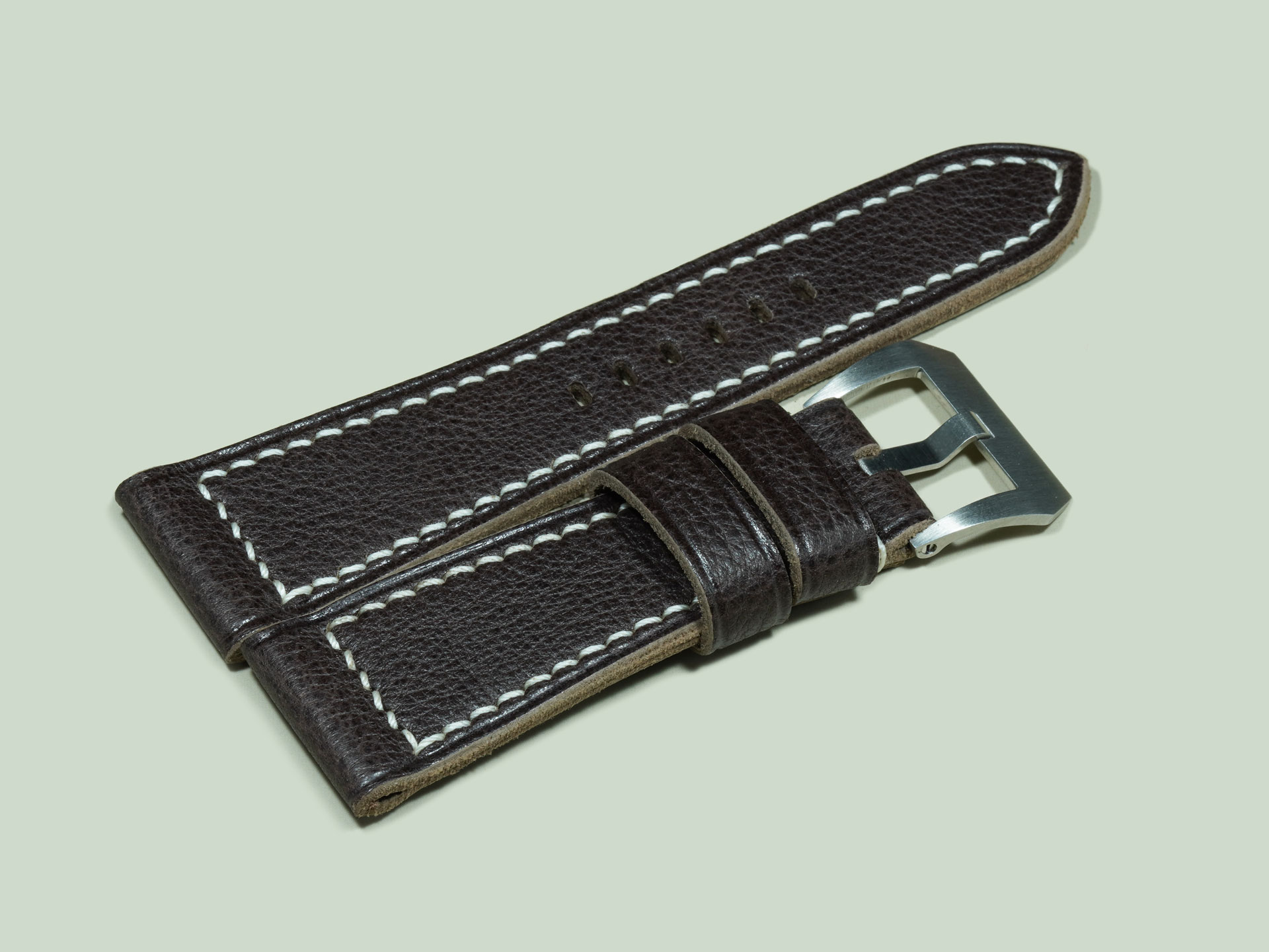 I stitched the strap by hand with ivory thread, creating a bold contrast against the dark leather. The boxed stitch pattern is reinforced at the buckle end for long-lasting durability. Clean, creased edges frame the strap, underscoring craftsmanship and refinement. The design features one fixed keeper and one floating keeper. The strap is designed for OEM-style buckles but may also be made with a sewn-in vintage buckle. The sizing here is 27mm at the lugs tapering to 22mm at the buckle, a proportion that balances well on Radiomir cases.