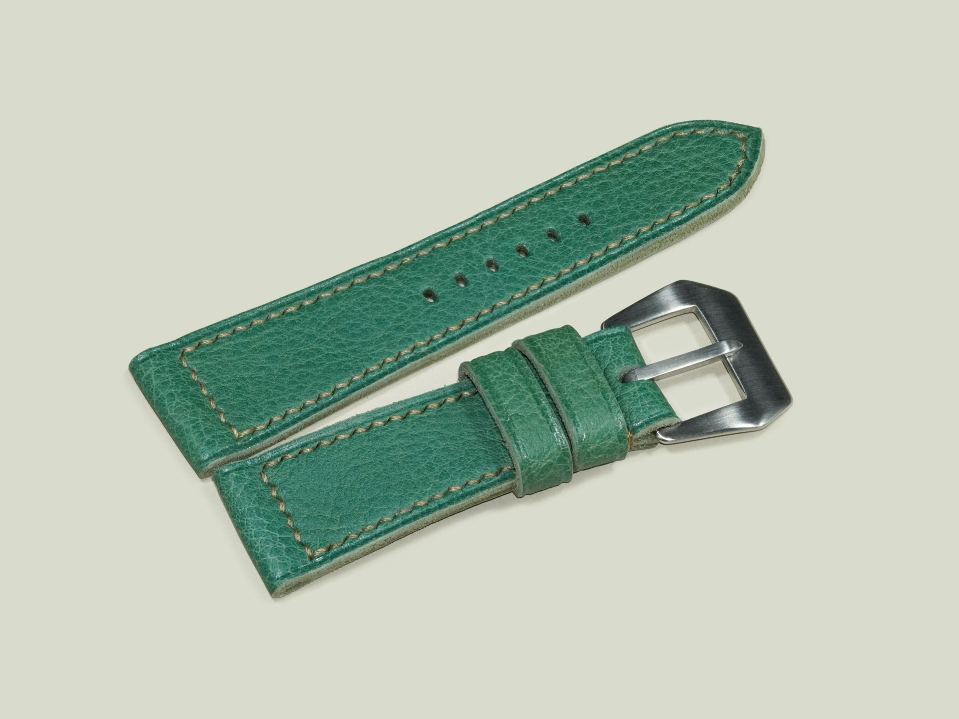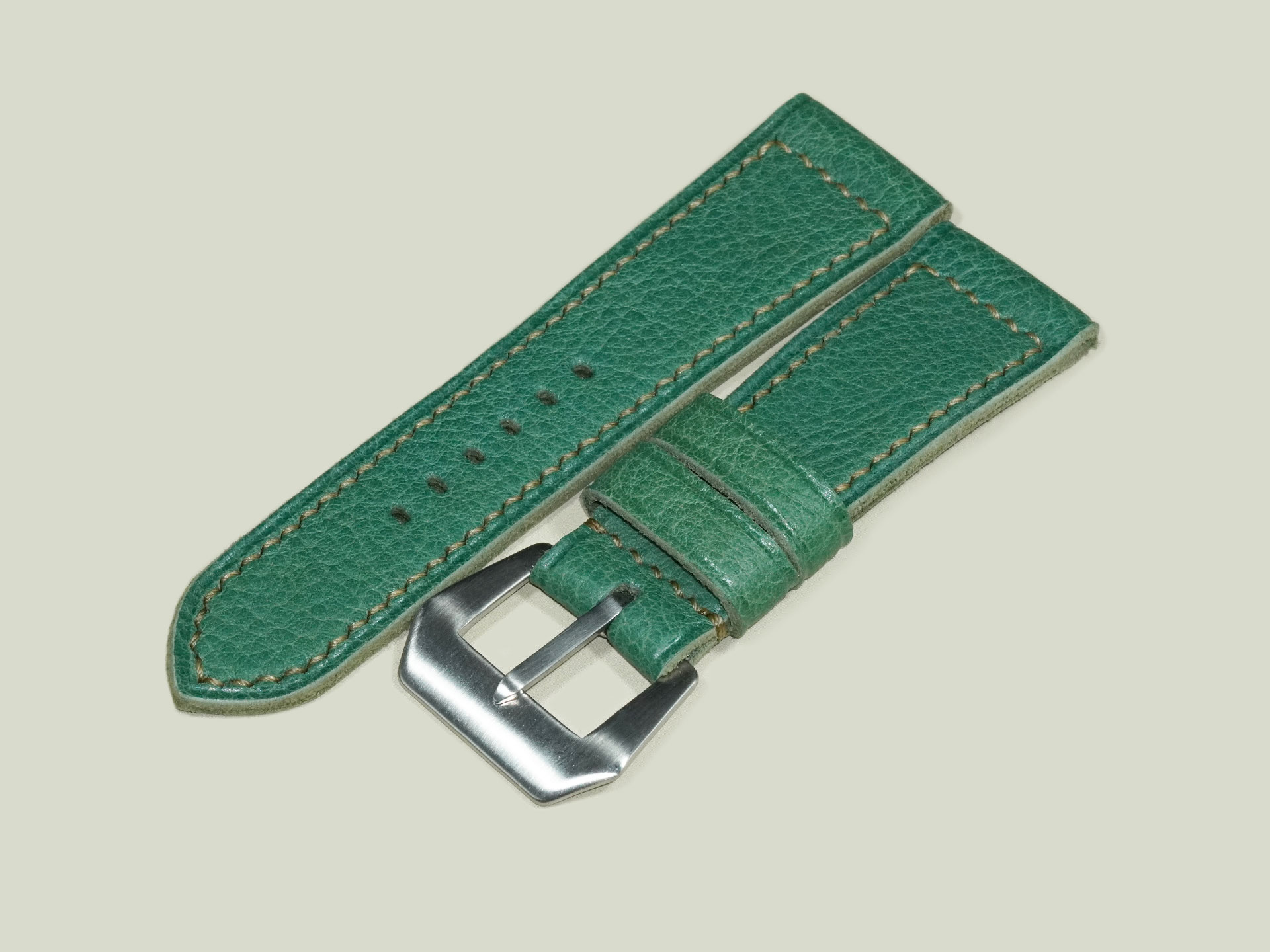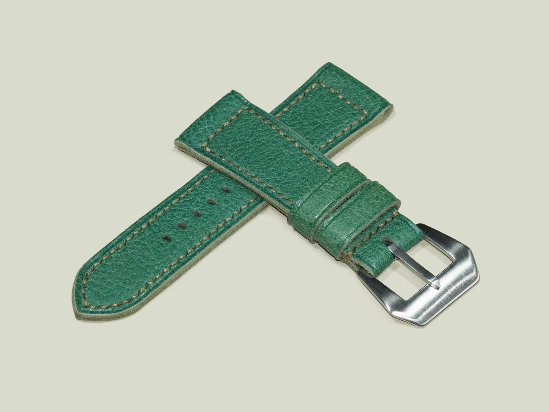 About the Leather:Crafted from supple, oil-tanned leather, this Green Panerai Radiomir Strap measures 3.5mm in thickness, offering durability while maintaining excellent comfort on the wrist. The deep green surface has a smooth finish, highlighted by subtle beige hand stitching that adds a refined contrast. Entirely handmade, this strap reflects exceptional craftsmanship—from the cleanly punched buckle holes to the carefully executed hand-sewn details. The stitching is done in a precise box pattern, further emphasizing its artisanal quality.