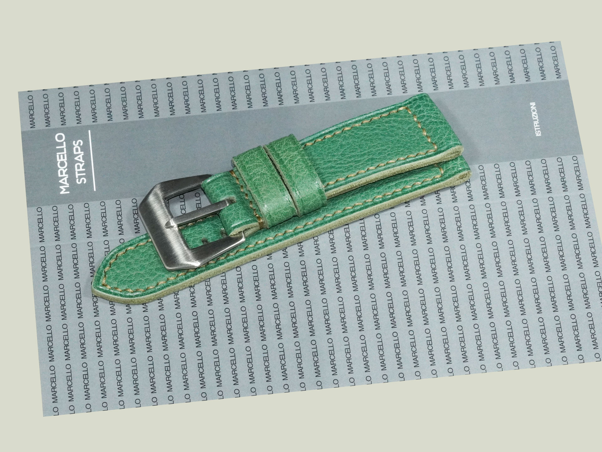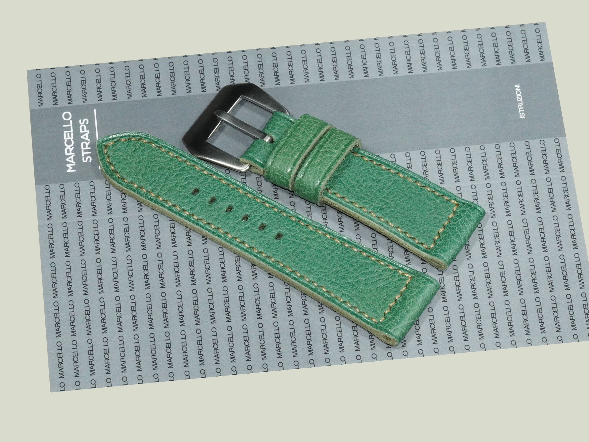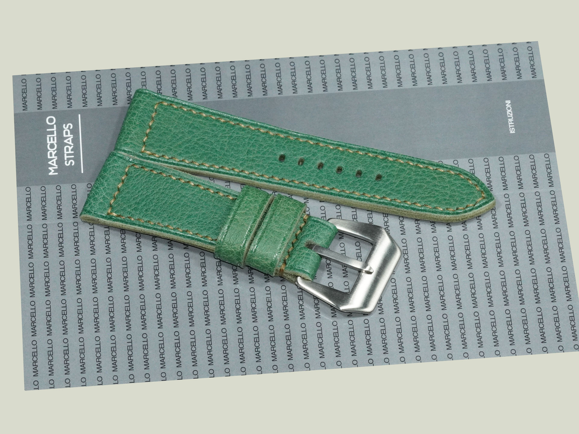 About the Leather:Crafted from supple, oil-tanned leather, this Green Panerai Radiomir Strap measures 3.5mm in thickness, offering durability while maintaining excellent comfort on the wrist. The deep green surface has a smooth finish, highlighted by subtle beige hand stitching that adds a refined contrast. Entirely handmade, this strap reflects exceptional craftsmanship—from the cleanly punched buckle holes to the carefully executed hand-sewn details. The stitching is done in a precise box pattern, further emphasizing its artisanal quality.