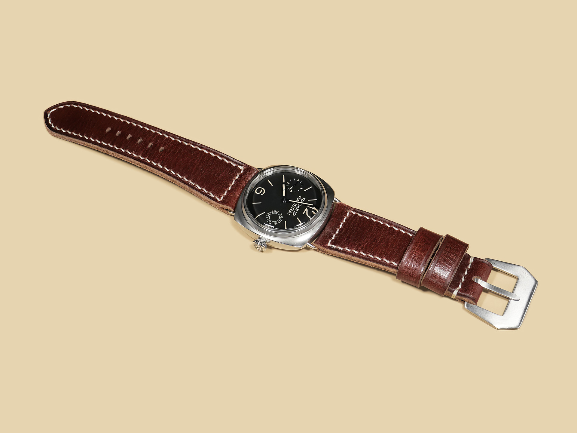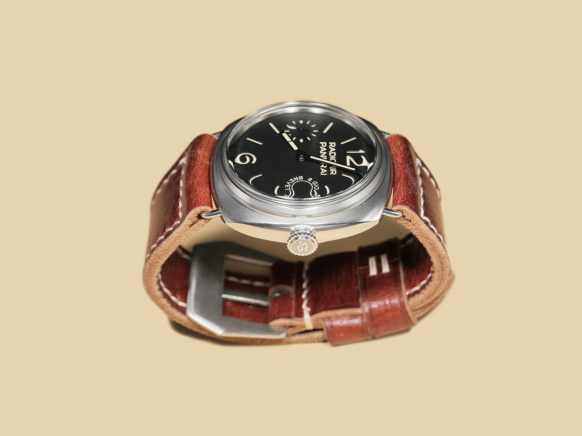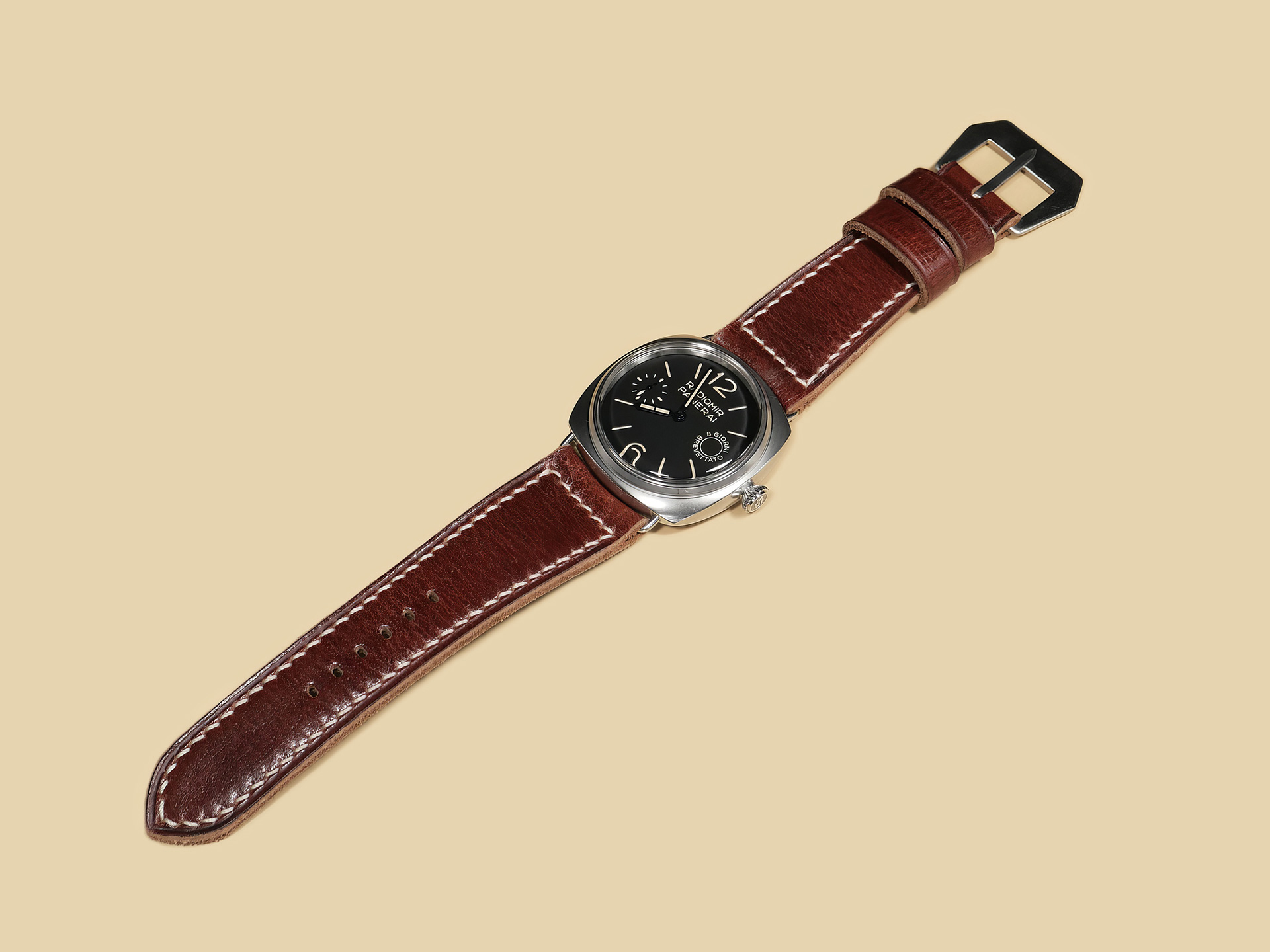 Due to the wire lugs of the typical Panerai Radiomir case, I tend to lean towards leathers of a slightly softer and more pliable temper. From a design perspective, I tend to utilize a taper of 27-22 or 26-22 depending on the leather. If you have a larger 47mm Radiomir case, like a PAM323, I highly recommend going with straps of 4.5mm thickness or above. I have even designed some custom aftermarket Radiomir straps specifically for the 47mm Radiomir cases that have a bolstered taper where the strap meets the case.