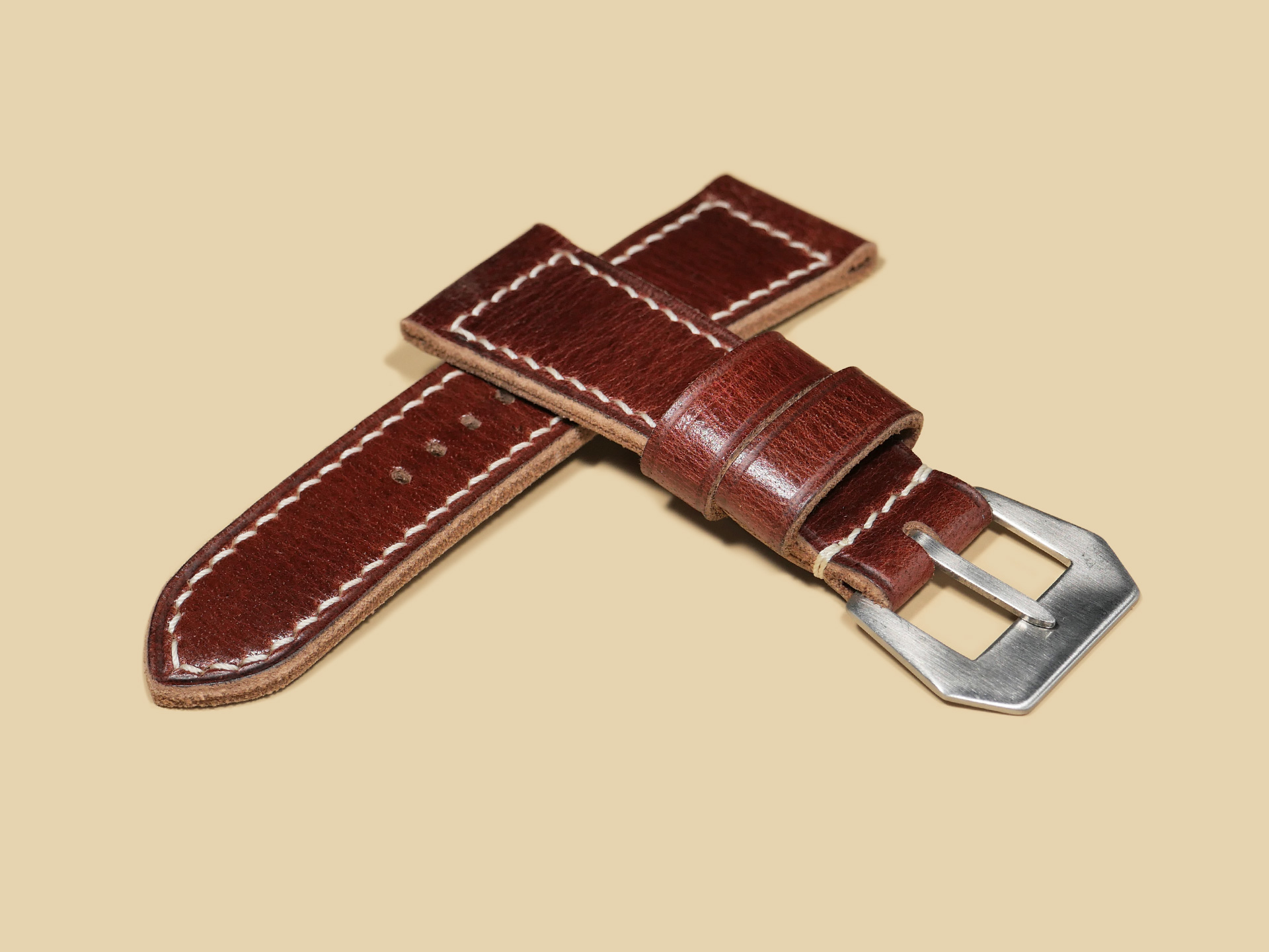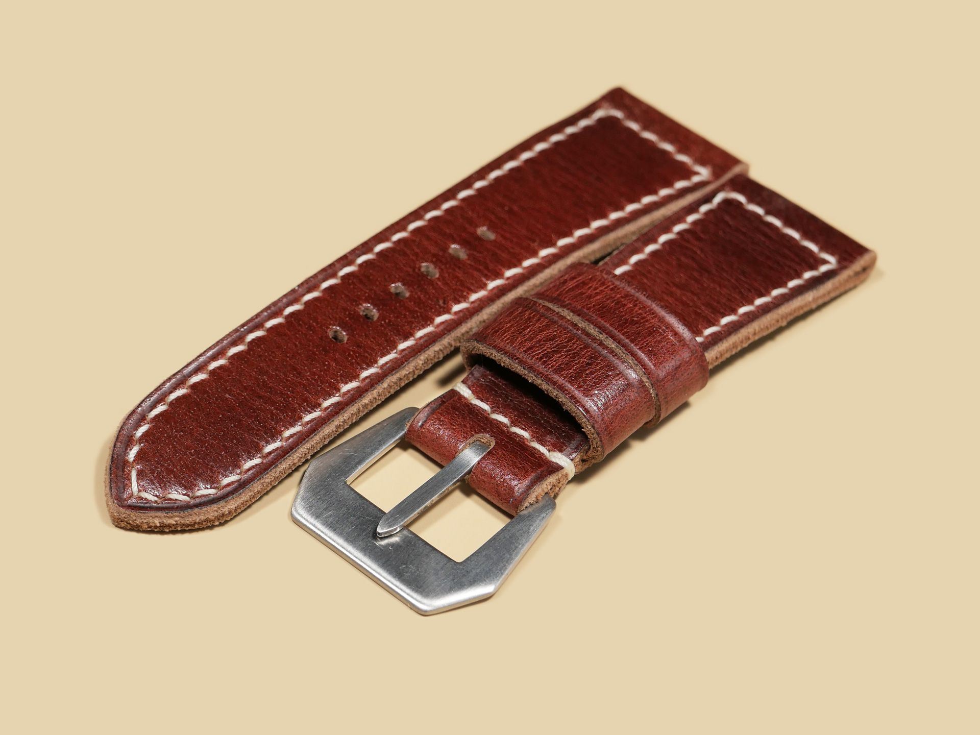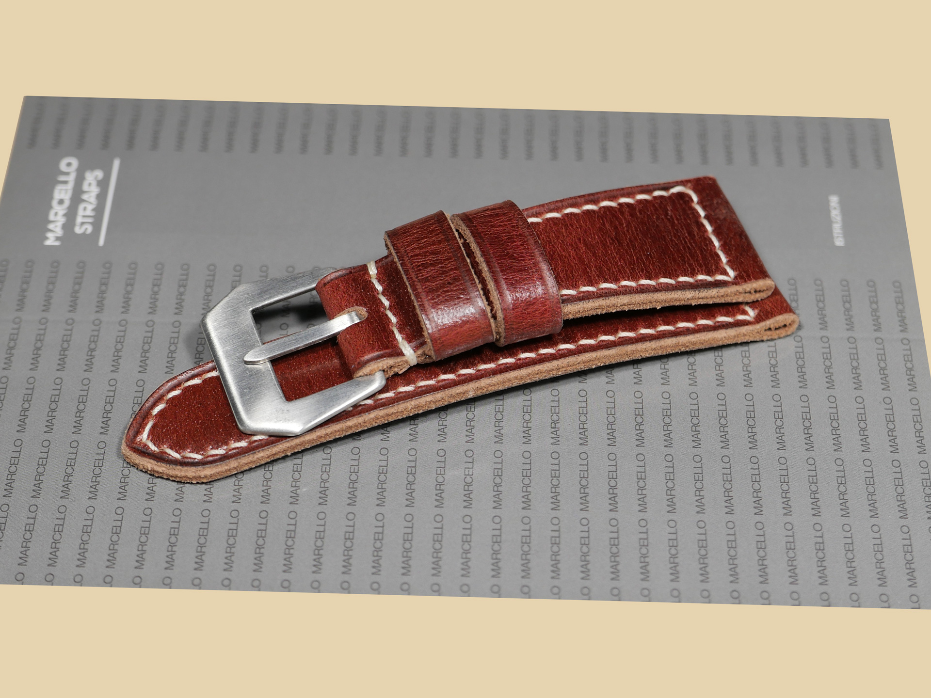 About the Leather: For this Radiomir strap project, I selected a thick, combination tanned water buffalo hide with a rugged finish. This cherry red leather is of a medium temper and is relatively thick, lending it characteristics of durability. As with all of my Panerai Radiomir straps, this rugged strap is completely handcrafted from start to finish. Additionally, the stitching is all done by hand. For this strap, I selected an ivory white thread, thicker than usual to contrast the color tone of the leather. The stitching is completed in a boxed pattern with an extra line of stitching at the buckle. I designed this strap in the traditional way, with the fold terminating at the buckle end. On a softness scale of 1-10 with 10 being the softest possible leather, this strap is about a 5 or 6.