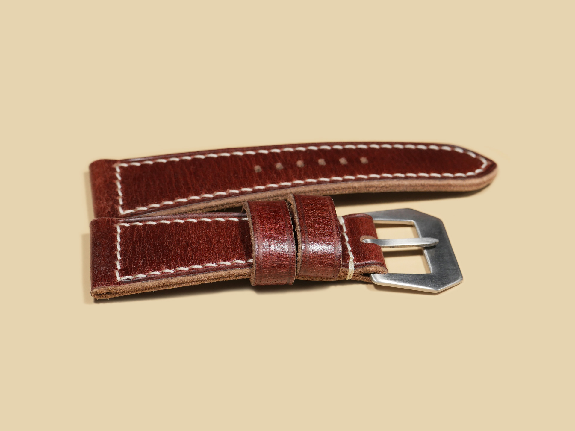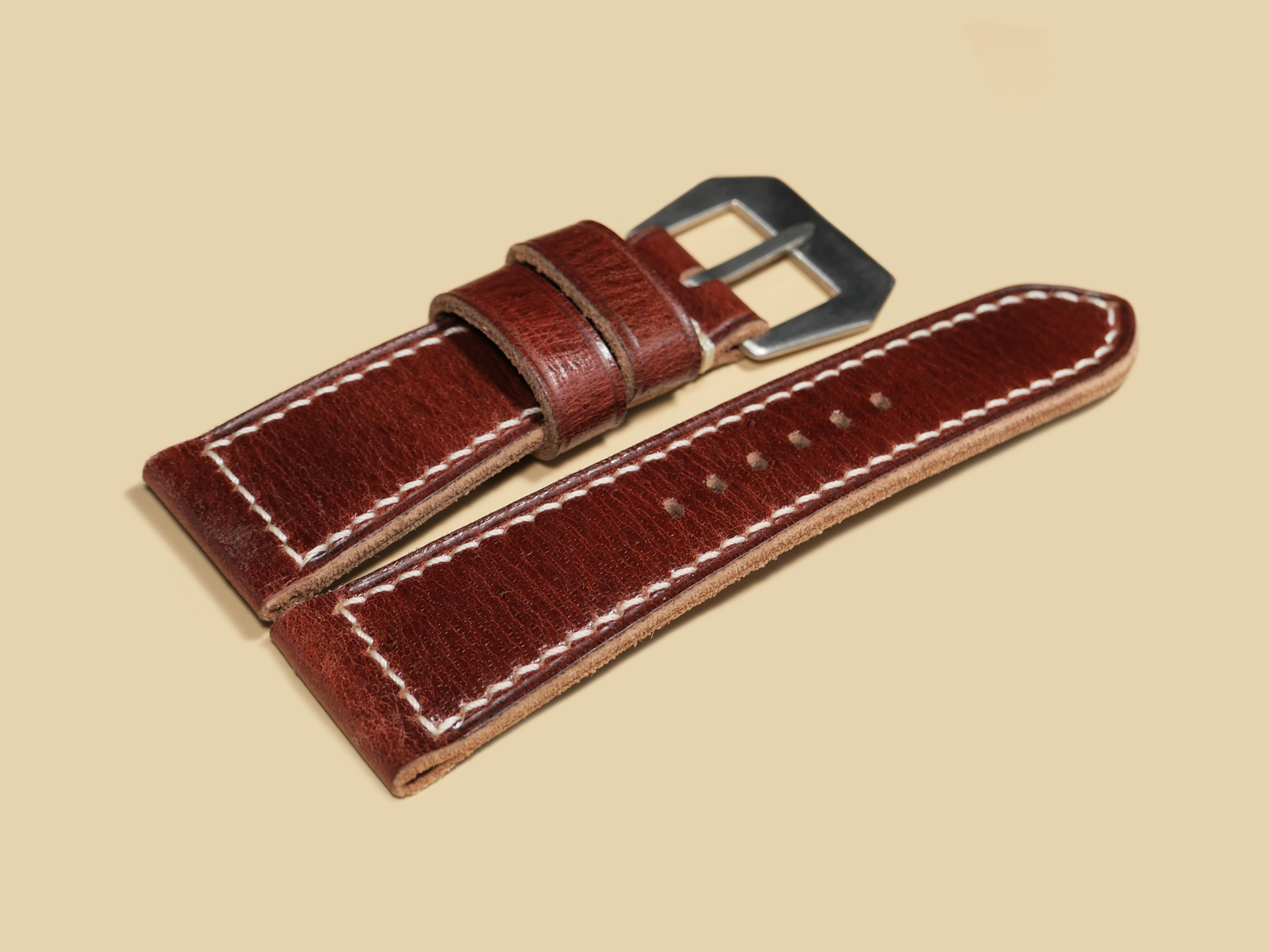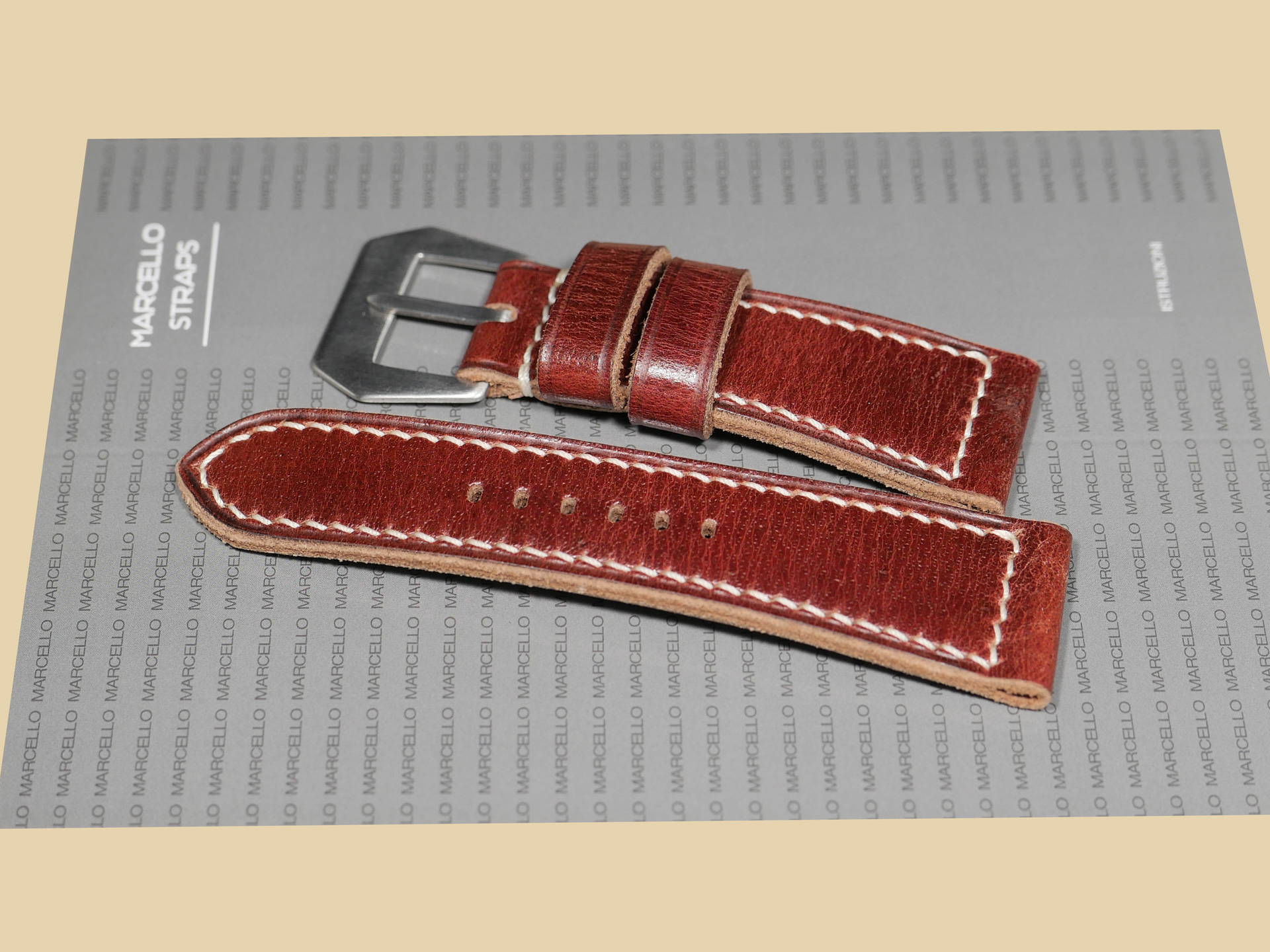 About the Leather: For this Radiomir strap project, I selected a thick, combination tanned water buffalo hide with a rugged finish. This cherry red leather is of a medium temper and is relatively thick, lending it characteristics of durability. As with all of my Panerai Radiomir straps, this rugged strap is completely handcrafted from start to finish. Additionally, the stitching is all done by hand. For this strap, I selected an ivory white thread, thicker than usual to contrast the color tone of the leather. The stitching is completed in a boxed pattern with an extra line of stitching at the buckle. I designed this strap in the traditional way, with the fold terminating at the buckle end. On a softness scale of 1-10 with 10 being the softest possible leather, this strap is about a 5 or 6.