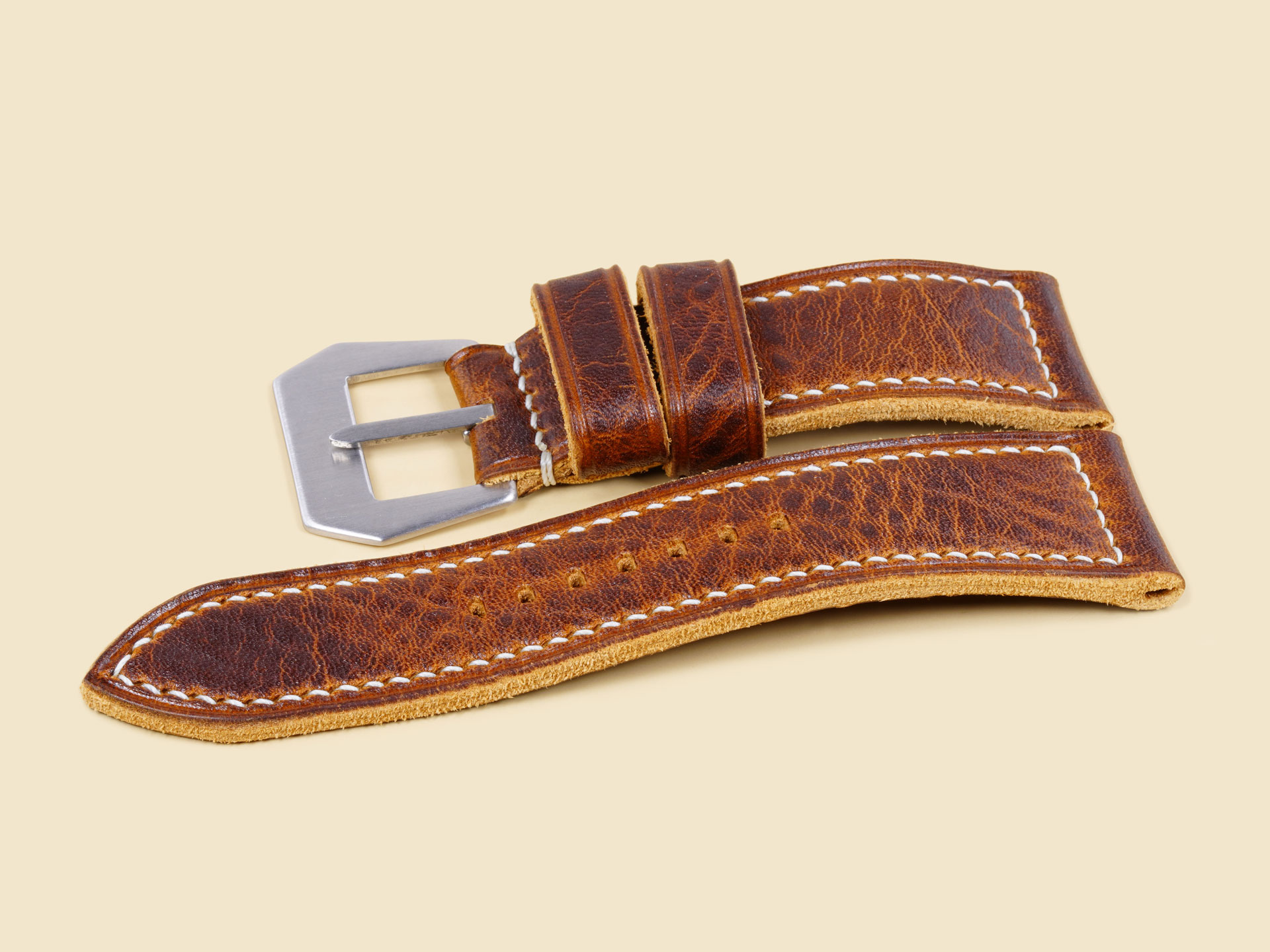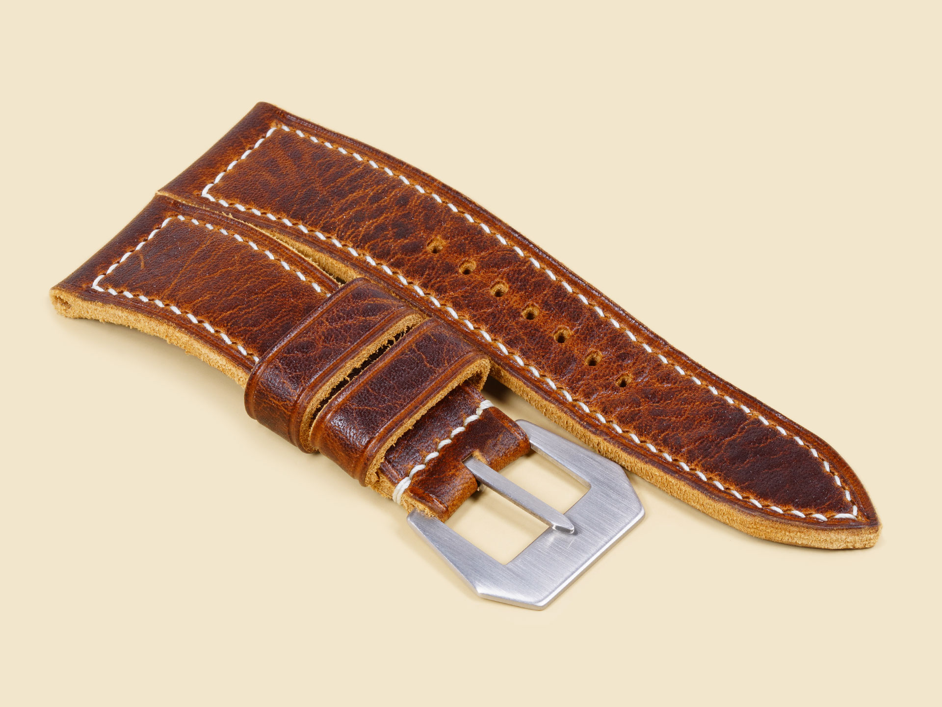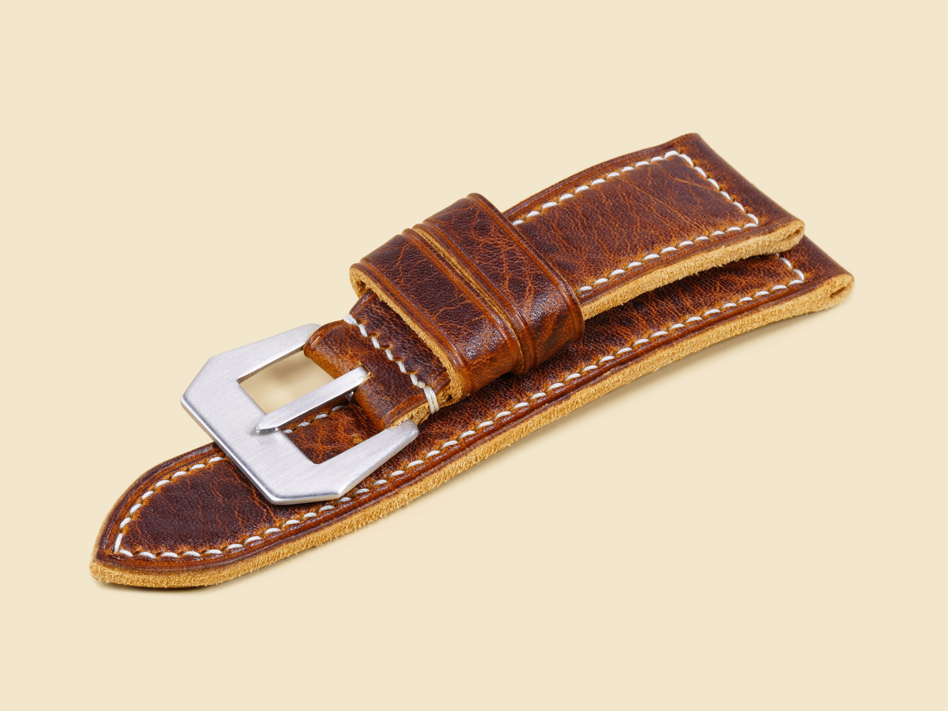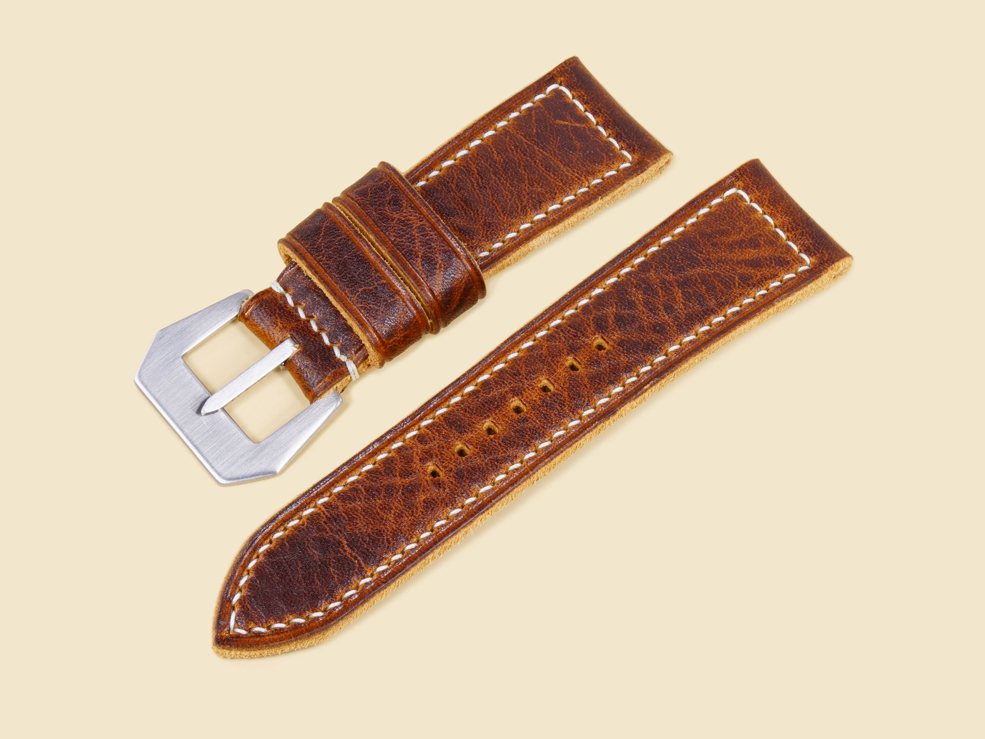 This strap is a monster, redesigned specifically for the bold proportions of Panerai Radiomir timepieces. Crafted from premium chrome-tanned hide selected for its rugged durability and unique texture, this leather originates from Mexico—a region with a storied heritage in world-class tanning.
