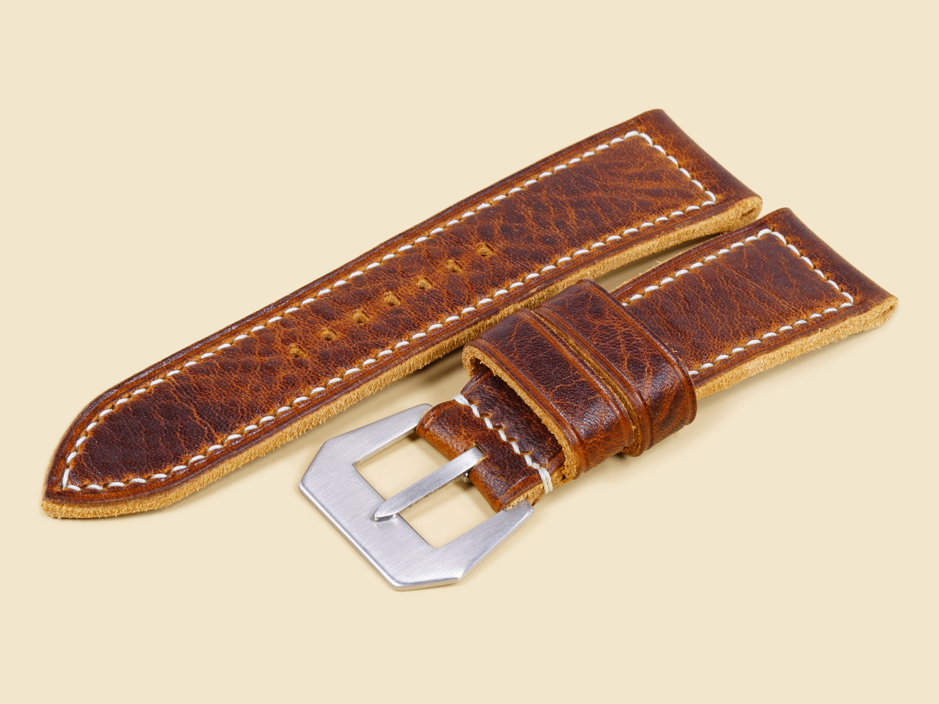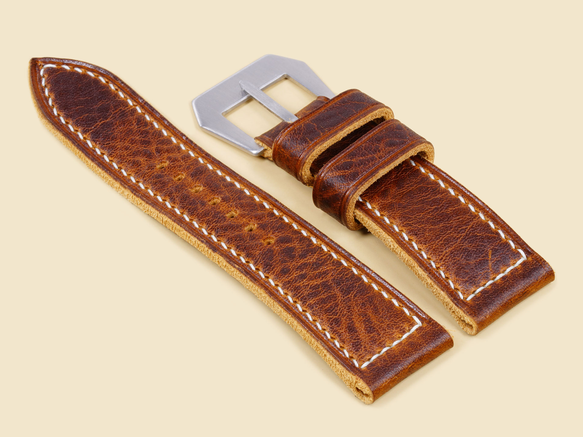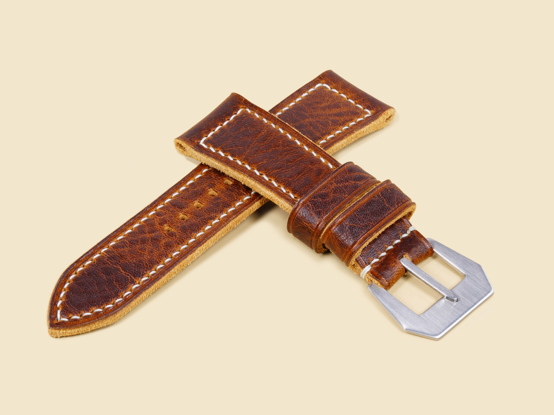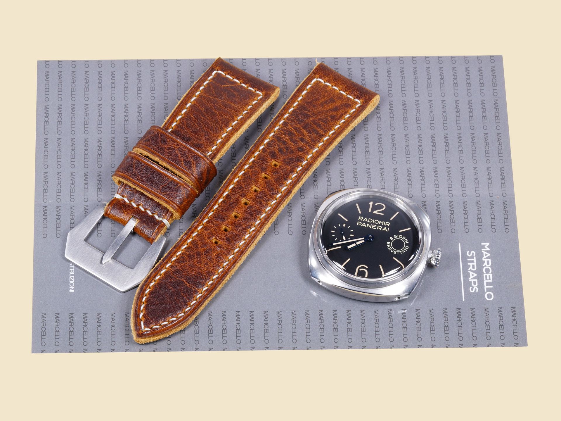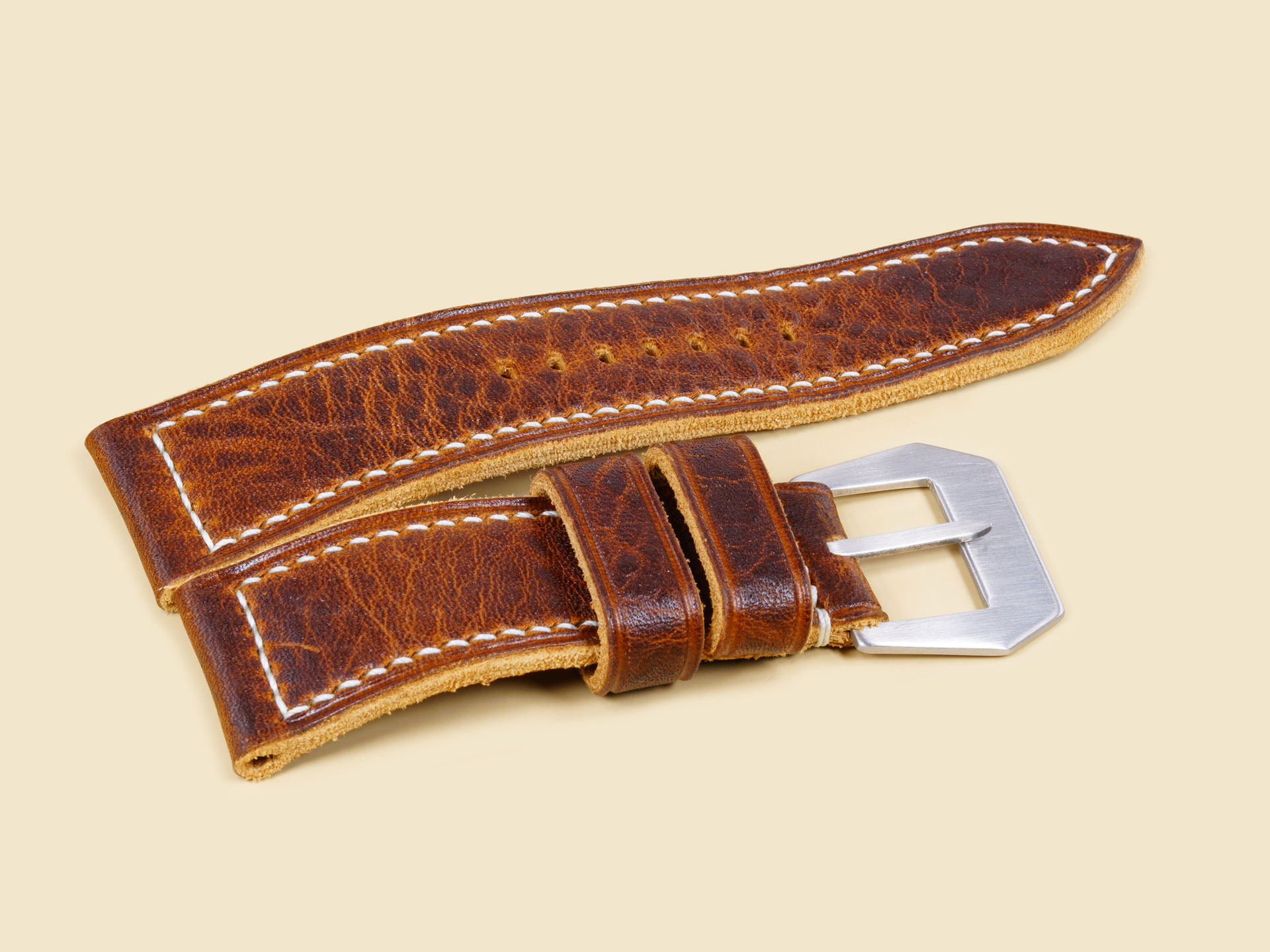This strap is a monster, redesigned specifically for the bold proportions of Panerai Radiomir timepieces. Crafted from premium chrome-tanned hide selected for its rugged durability and unique texture, this leather originates from Mexico—a region with a storied heritage in world-class tanning.