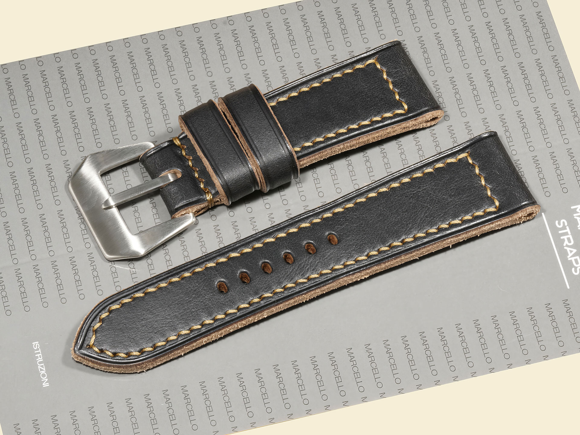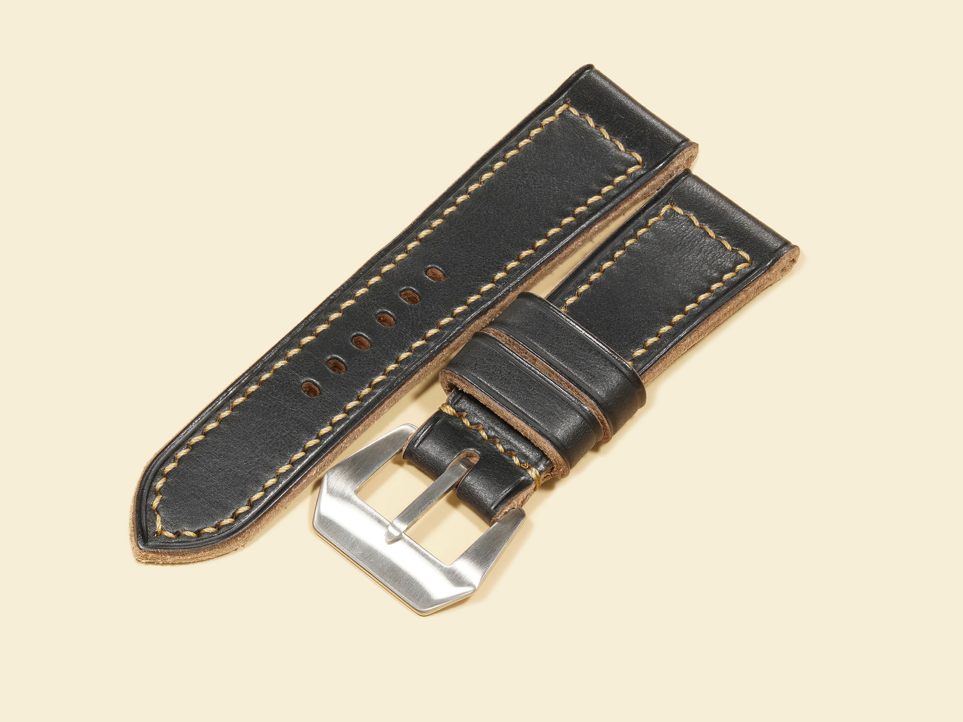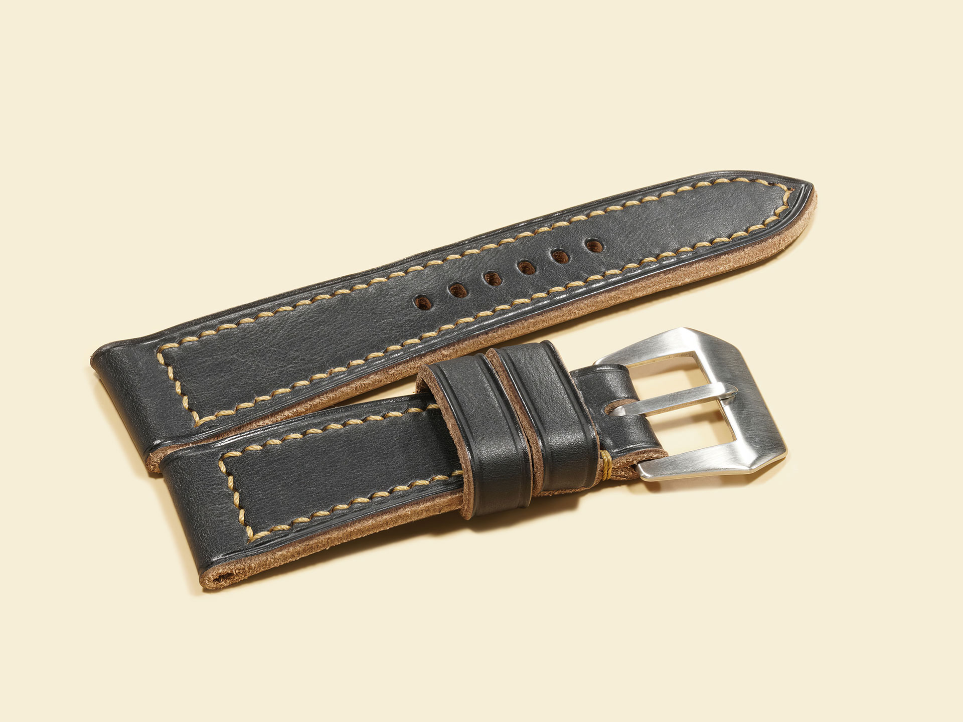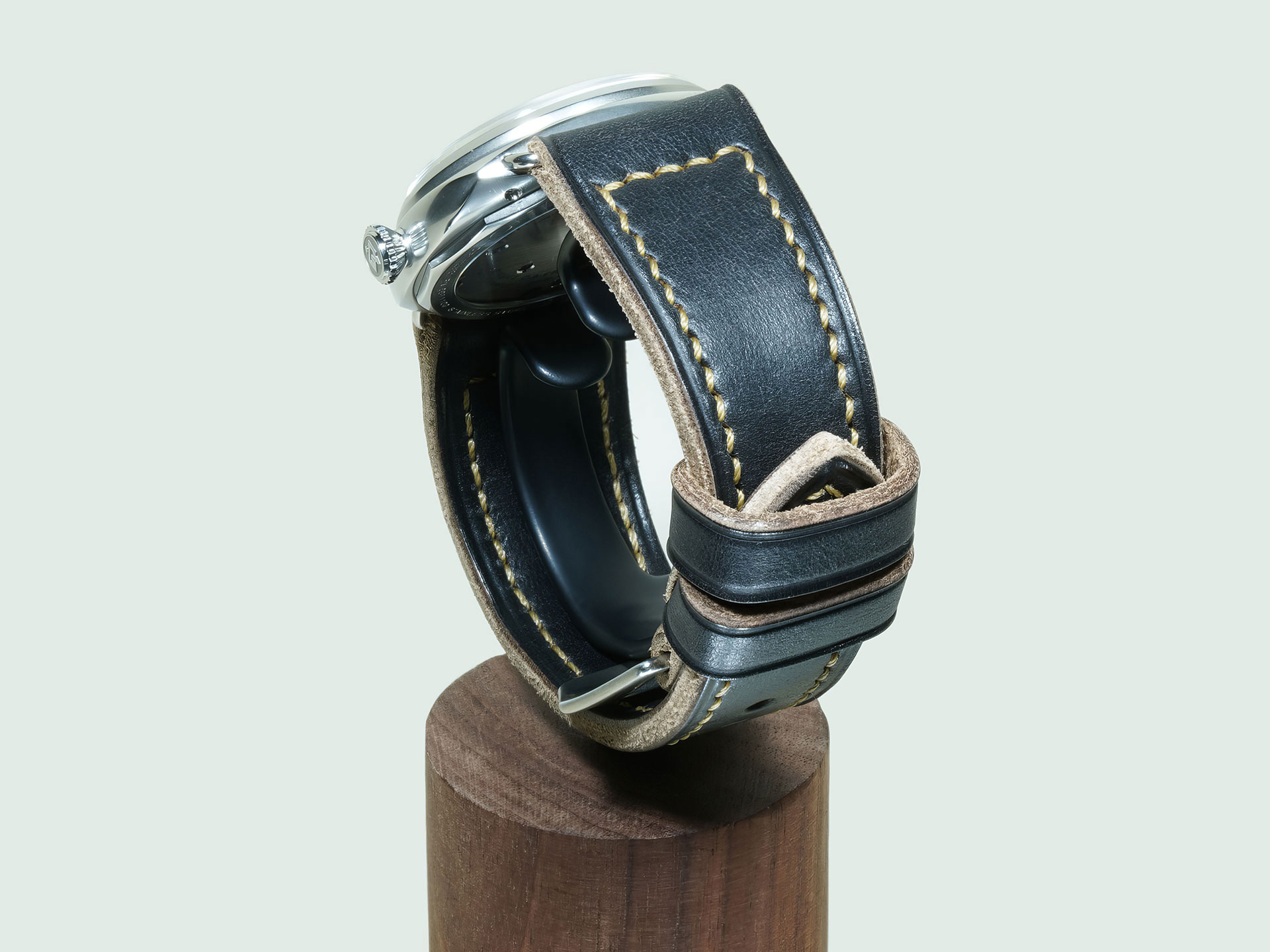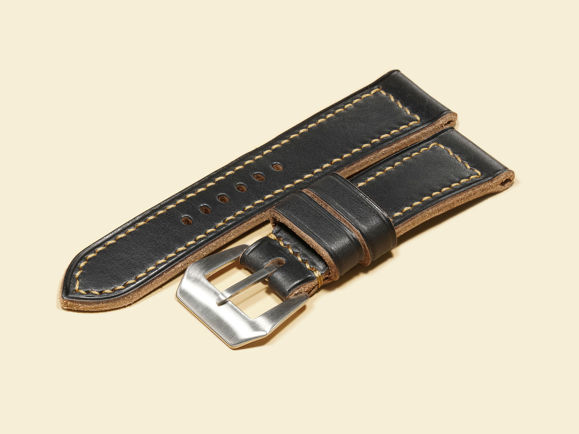 The stitching is all done by hand with a thick beige thread in a tight boxed pattern — clean, strong, and built to last. It comes fitted with a curved vintage-style pin buckle that’s sewn in place, exactly like the old-school straps Panerai used decades ago. The edges are creased for a refined finish, and it includes both a fixed and a floating keeper for that authentic, functional touch.