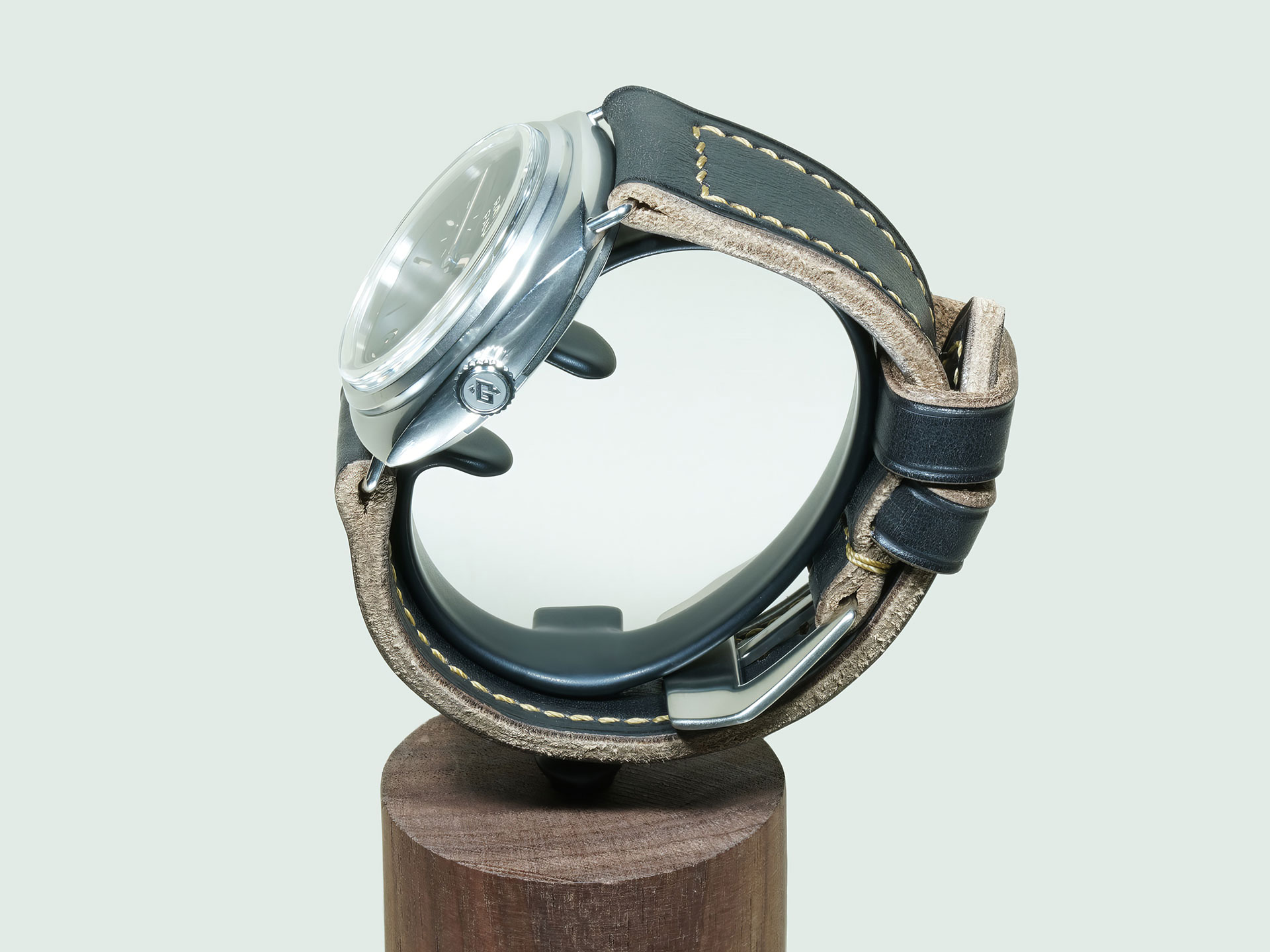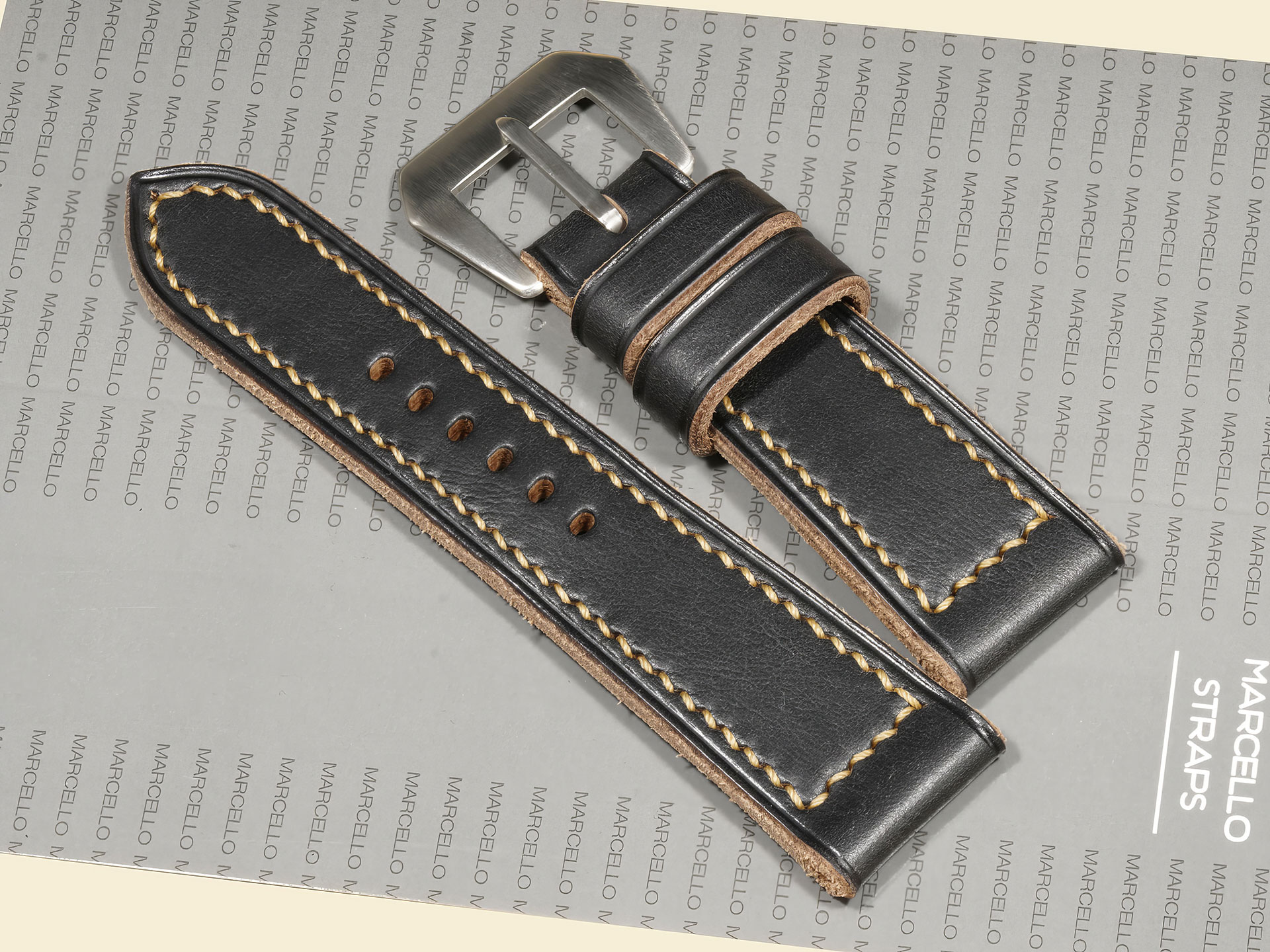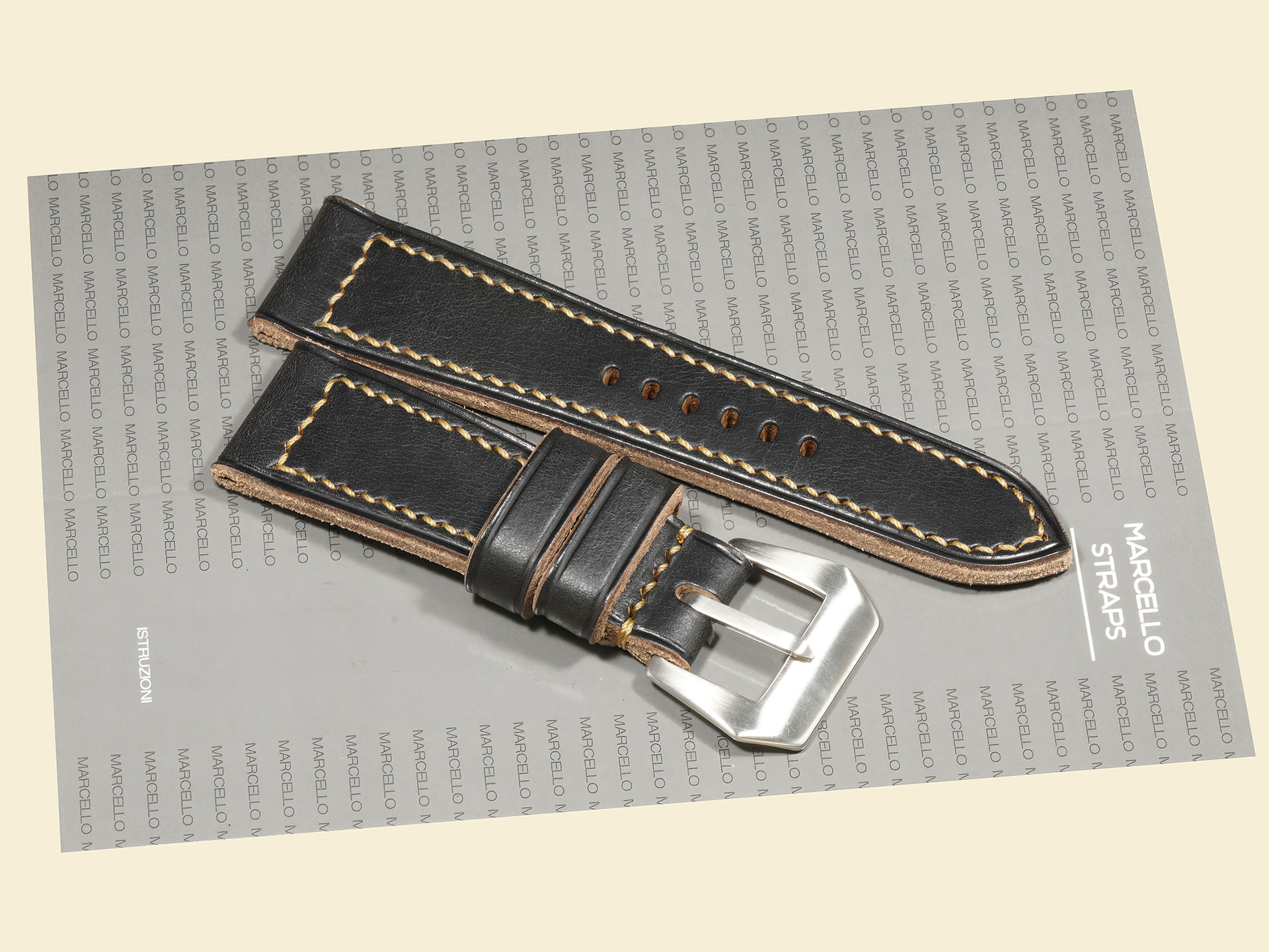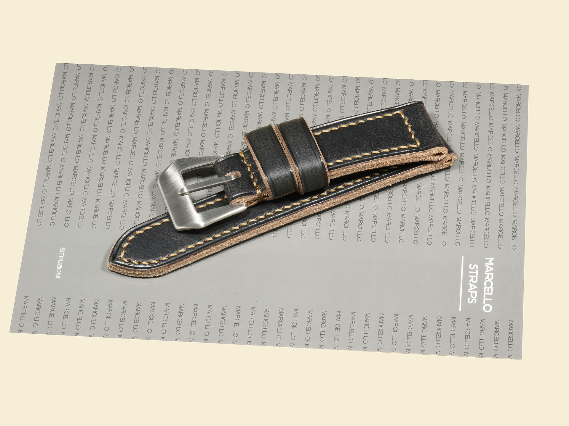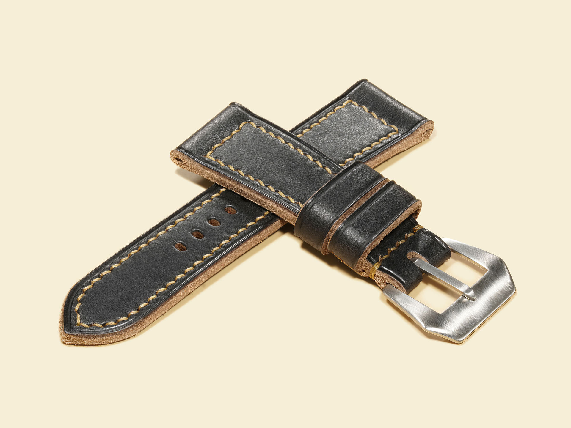 The stitching is all done by hand with a thick beige thread in a tight boxed pattern — clean, strong, and built to last. It comes fitted with a curved vintage-style pin buckle that’s sewn in place, exactly like the old-school straps Panerai used decades ago. The edges are creased for a refined finish, and it includes both a fixed and a floating keeper for that authentic, functional touch.